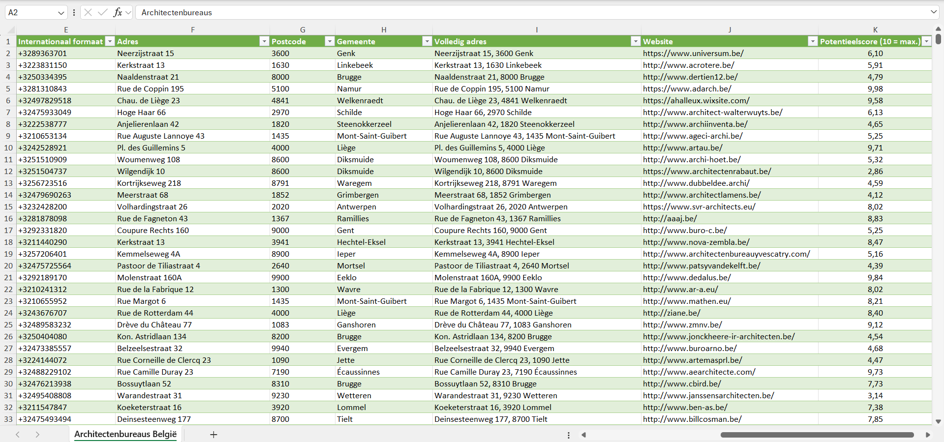 Voor elk architectenbureau hebben we bovendien een individuele potentieelscore van 1 tot 10 toegekend, gebaseerd op een reeks factoren zoals de geschatte bedrijfsgrootte, het geschatte aantal klanten en de koopkracht van de locatie.