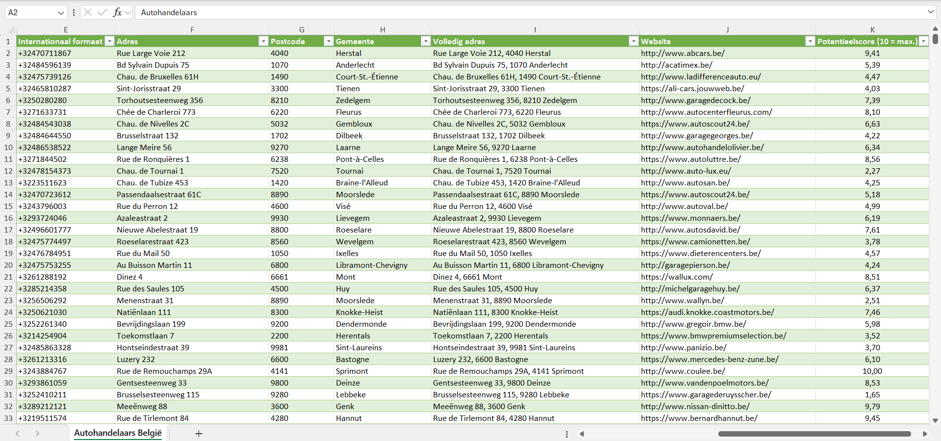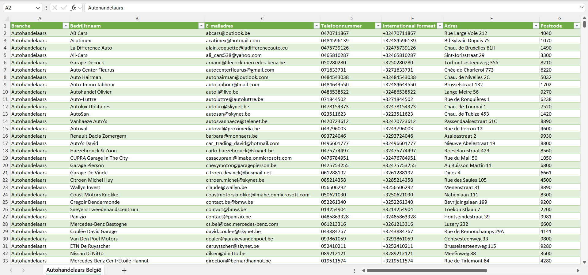 Na aankoop kun je de lijst met alle autohandelaars in België direct downloaden als Excel-bestand. Deze is geschikt voor gebruik in veelgebruikte CRM- en verkoopsoftware, zoals Salesforce, Pipedrive, HubSpot, Mailchimp, Klaviyo, ActiveCampaign en andere. Op verzoek leveren we de gegevens van de autohandelaars ook in andere formaten, zoals CSV.