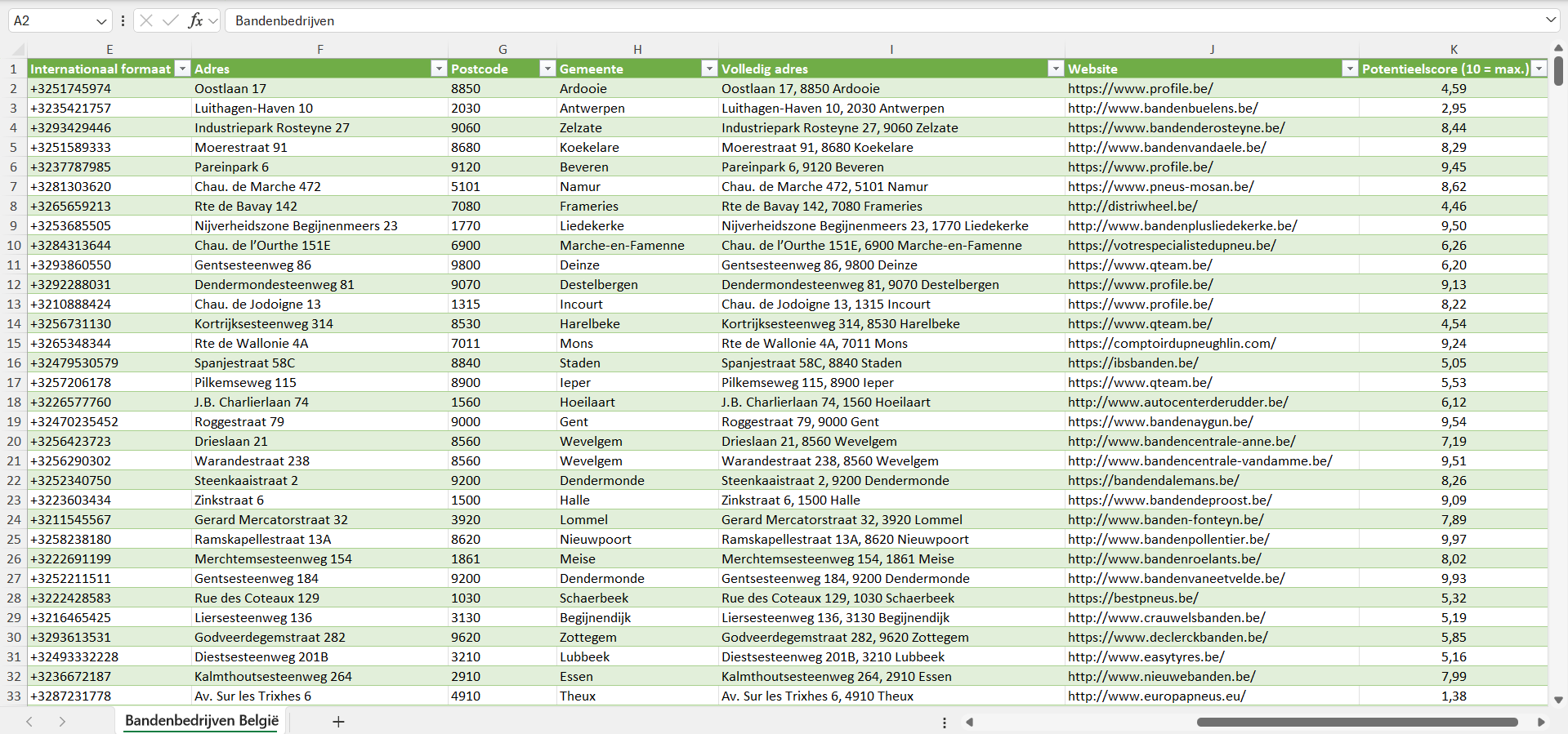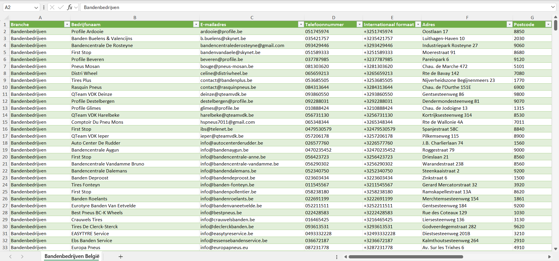 Na aankoop kun je de lijst met alle bandenbedrijven in België direct downloaden als Excel-bestand. Deze is geschikt voor gebruik in veelgebruikte CRM- en verkoopsoftware, zoals Salesforce, Pipedrive, HubSpot, Mailchimp, Klaviyo, ActiveCampaign en andere. Op verzoek leveren we de gegevens van de bandenbedrijven ook in andere formaten, zoals CSV.