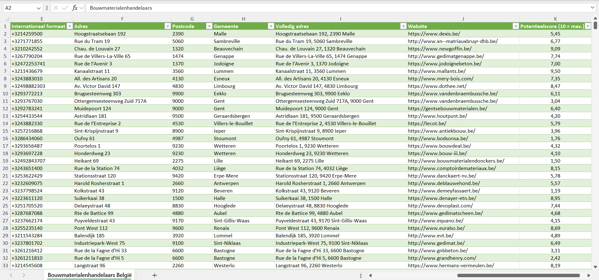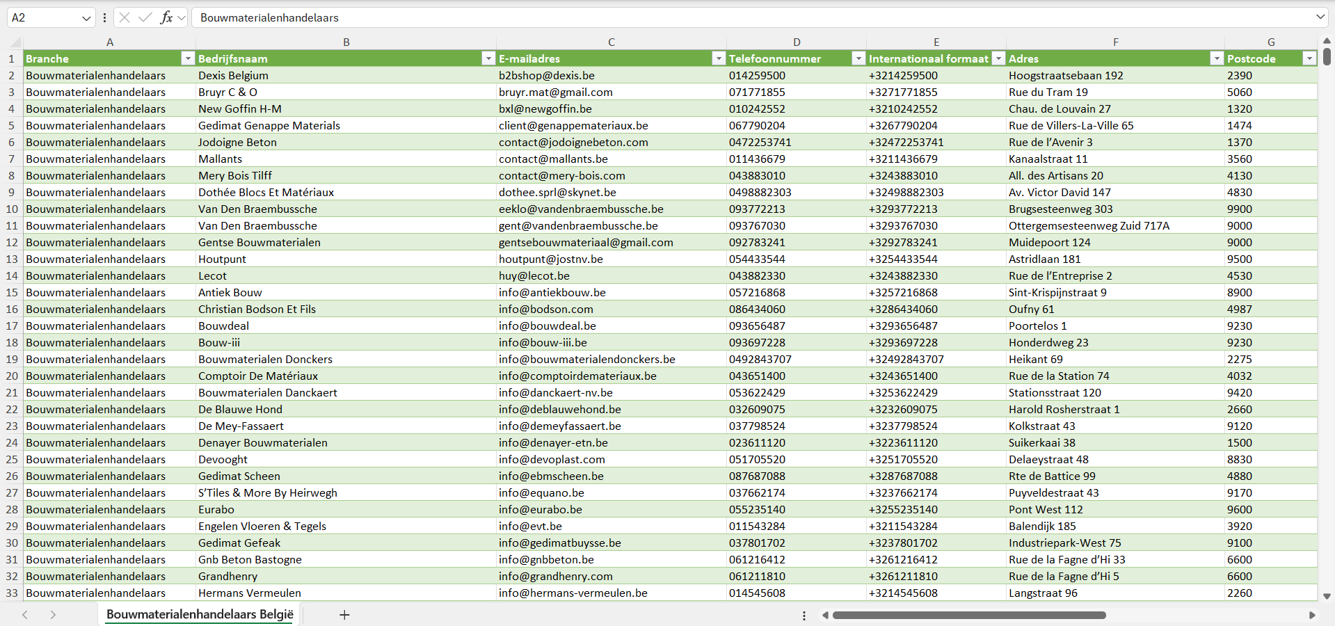 Na aankoop kun je de lijst met alle bouwmaterialenhandelaars in België direct downloaden als Excel-bestand. Deze is geschikt voor gebruik in veelgebruikte CRM- en verkoopsoftware, zoals Salesforce, Pipedrive, HubSpot, Mailchimp, Klaviyo, ActiveCampaign en andere. Op verzoek leveren we de gegevens van de bouwmaterialenhandelaars ook in andere formaten, zoals CSV.