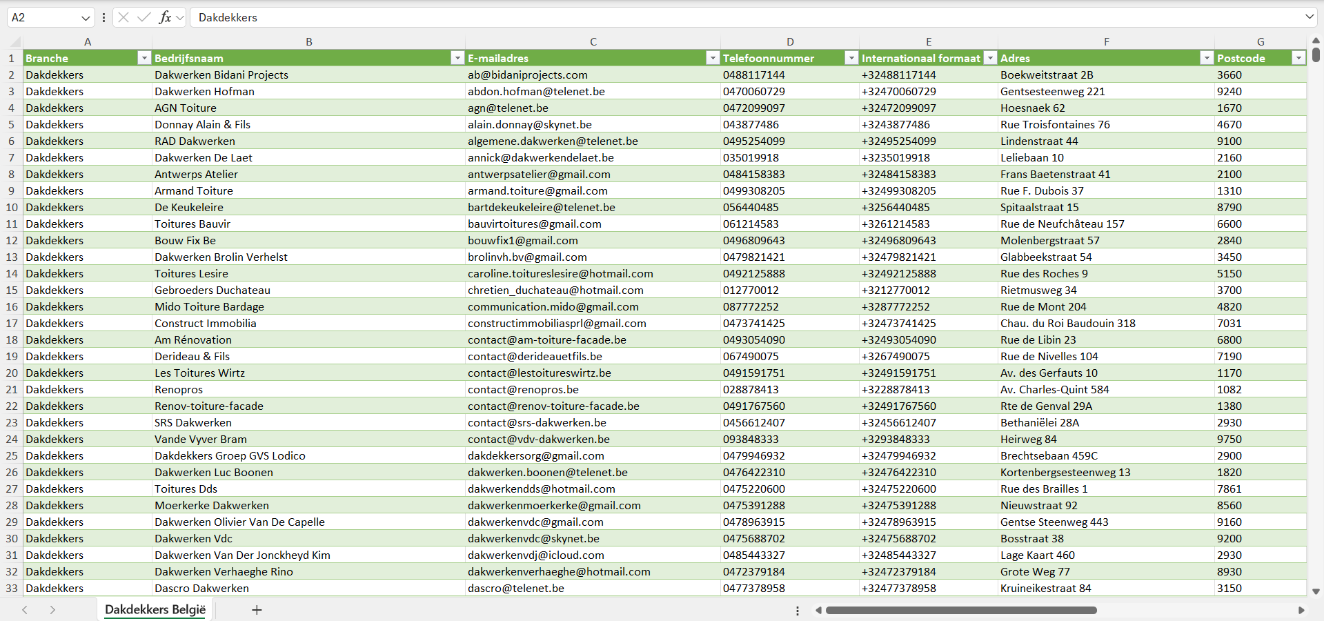 Na aankoop kun je de lijst met alle dakdekkers in België direct downloaden als Excel-bestand. Deze is geschikt voor gebruik in veelgebruikte CRM- en verkoopsoftware, zoals Salesforce, Pipedrive, HubSpot, Mailchimp, Klaviyo, ActiveCampaign en andere. Op verzoek leveren we de gegevens van de dakdekkers ook in andere formaten, zoals CSV.