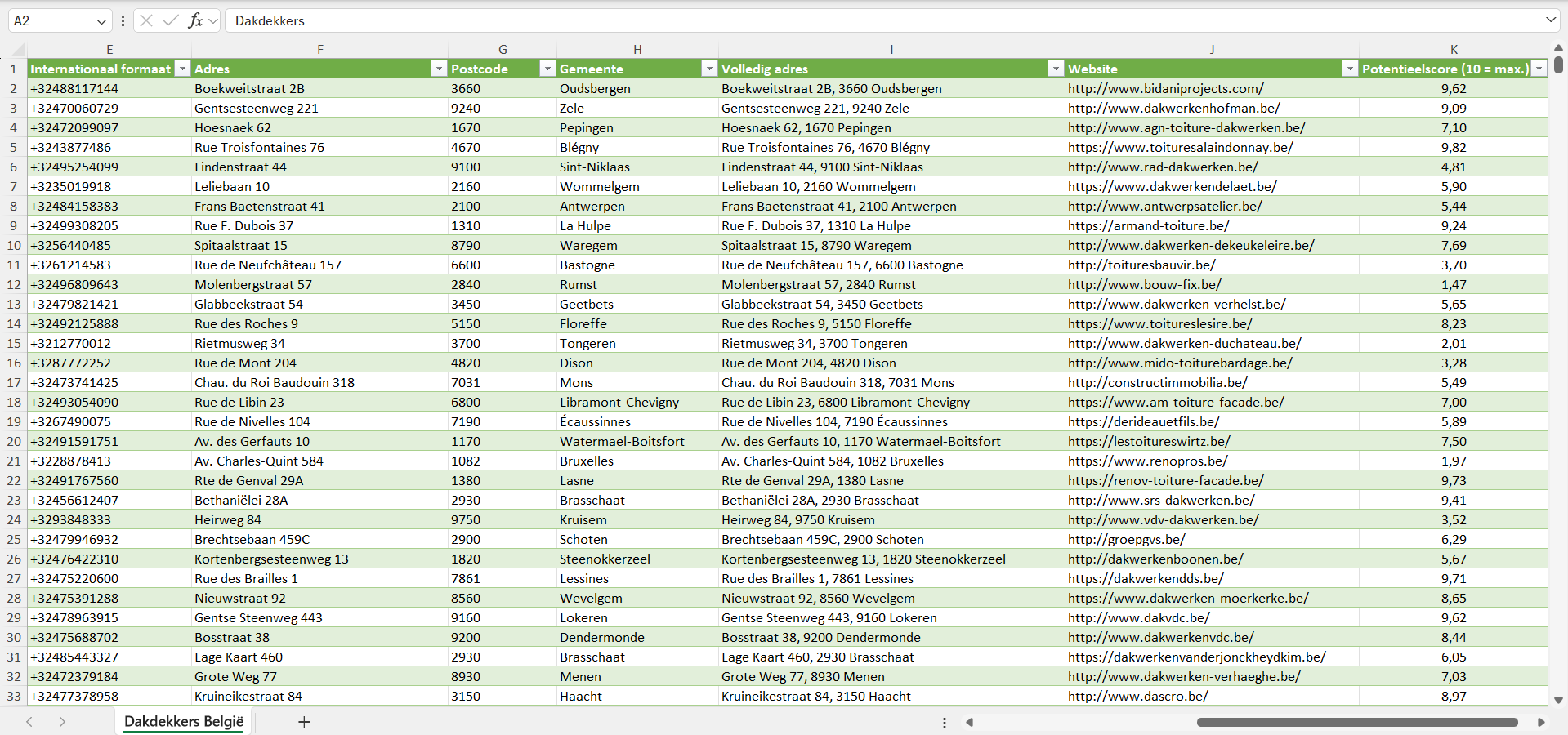 Voor elke dakdekker hebben we bovendien een individuele potentieelscore van 1 tot 10 toegekend, gebaseerd op een reeks factoren zoals de geschatte bedrijfsgrootte, het geschatte aantal klanten en de koopkracht van de locatie.
