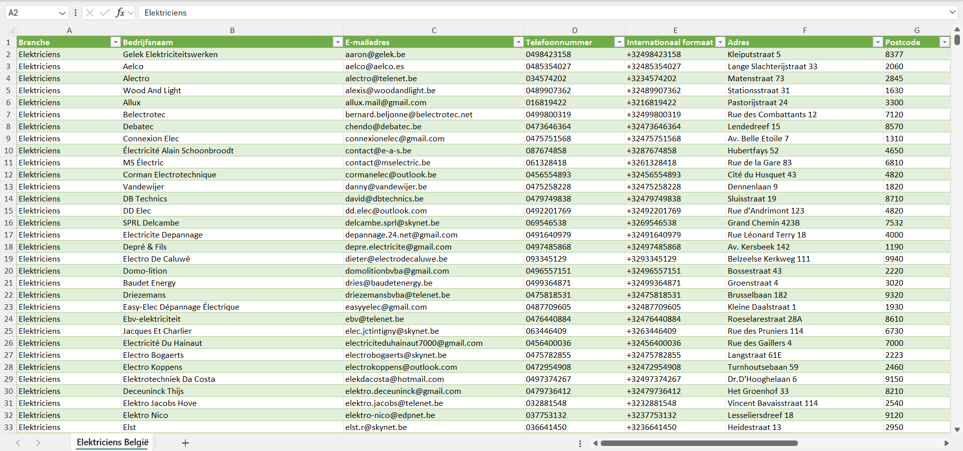 Na aankoop kun je de lijst met alle elektriciens in België direct downloaden als Excel-bestand. Deze is geschikt voor gebruik in veelgebruikte CRM- en verkoopsoftware, zoals Salesforce, Pipedrive, HubSpot, Mailchimp, Klaviyo, ActiveCampaign en andere. Op verzoek leveren we de gegevens van de elektriciens ook in andere formaten, zoals CSV.