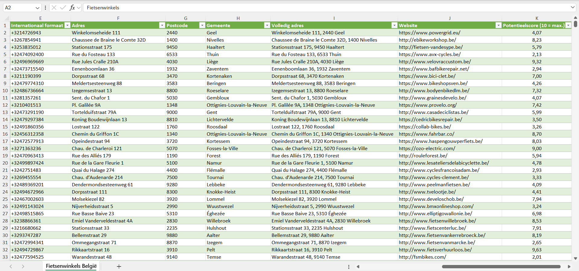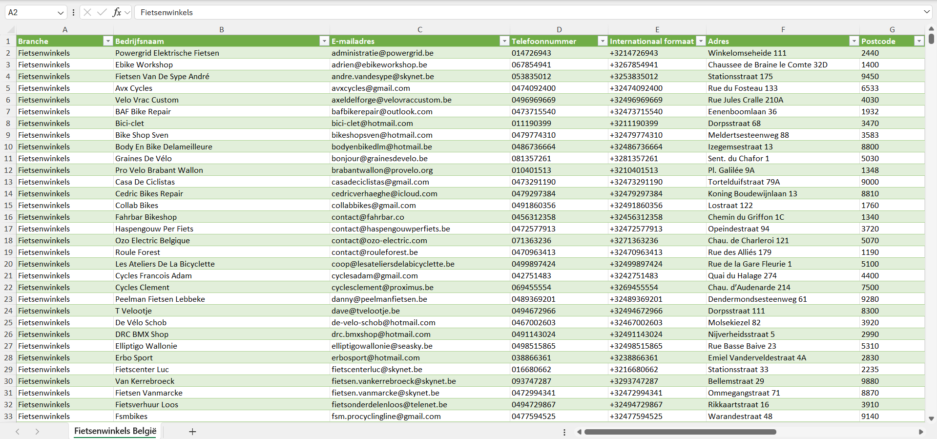 Na aankoop kun je de lijst met alle fietsenwinkels in België direct downloaden als Excel-bestand. Deze is geschikt voor gebruik in veelgebruikte CRM- en verkoopsoftware, zoals Salesforce, Pipedrive, HubSpot, Mailchimp, Klaviyo, ActiveCampaign en andere. Op verzoek leveren we de gegevens van de fietsenwinkels ook in andere formaten, zoals CSV.
