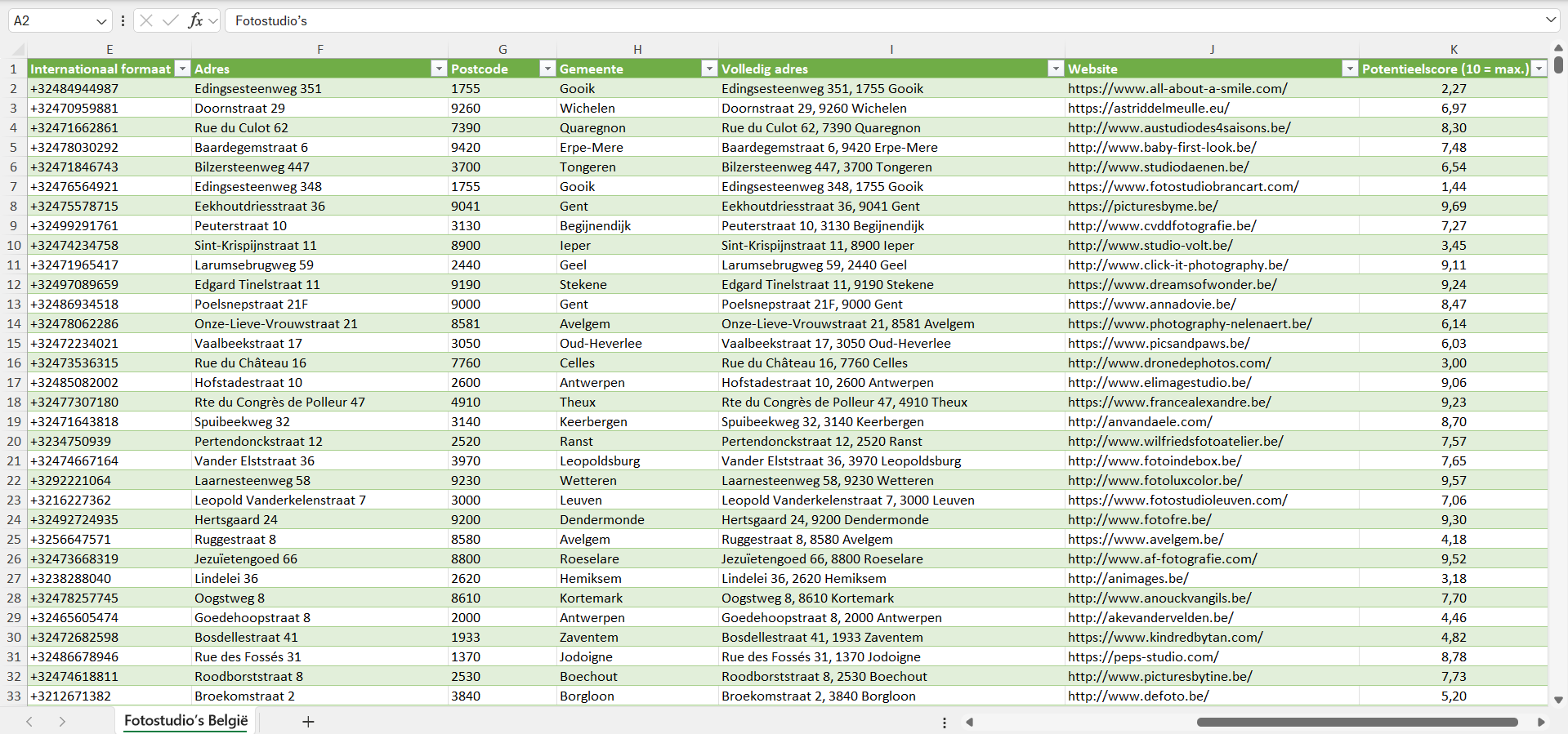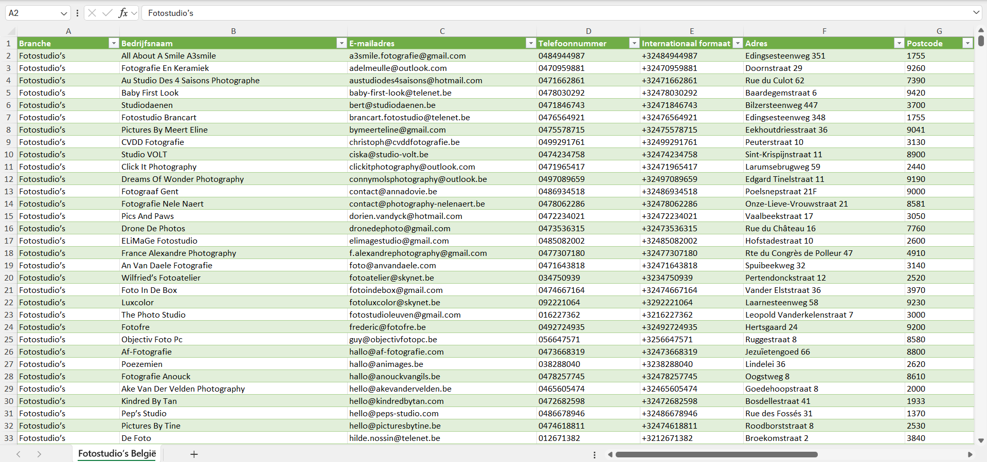Dataset van alle fotostudio’s in België
