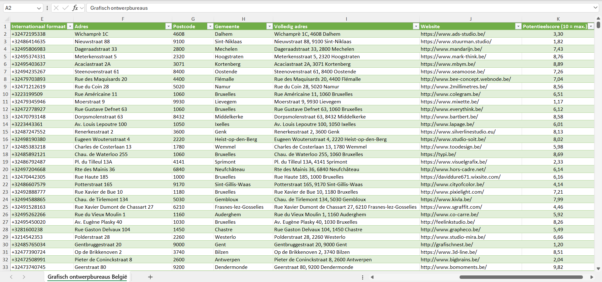 Voor elk grafisch ontwerpbureau hebben we bovendien een individuele potentieelscore van 1 tot 10 toegekend, gebaseerd op een reeks factoren zoals de geschatte bedrijfsgrootte, het geschatte aantal klanten en de koopkracht van de locatie.