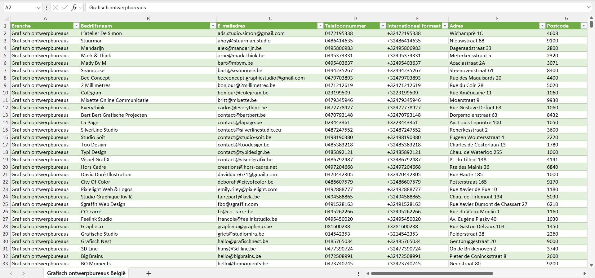 Na aankoop kun je de lijst met alle grafisch ontwerpbureaus in België direct downloaden als Excel-bestand. Deze is geschikt voor gebruik in veelgebruikte CRM- en verkoopsoftware, zoals Salesforce, Pipedrive, HubSpot, Mailchimp, Klaviyo, ActiveCampaign en andere. Op verzoek leveren we de gegevens van de grafisch ontwerpbureaus ook in andere formaten, zoals CSV.