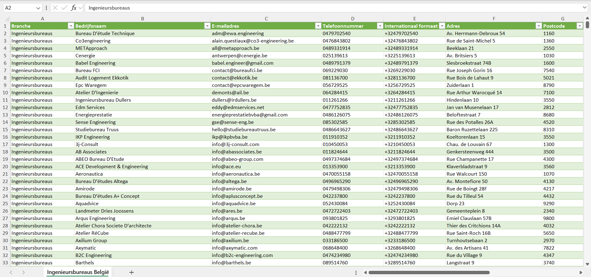 Na aankoop kun je de lijst met alle ingenieursbureaus in België direct downloaden als Excel-bestand. Deze is geschikt voor gebruik in veelgebruikte CRM- en verkoopsoftware, zoals Salesforce, Pipedrive, HubSpot, Mailchimp, Klaviyo, ActiveCampaign en andere. Op verzoek leveren we de gegevens van de ingenieursbureaus ook in andere formaten, zoals CSV.