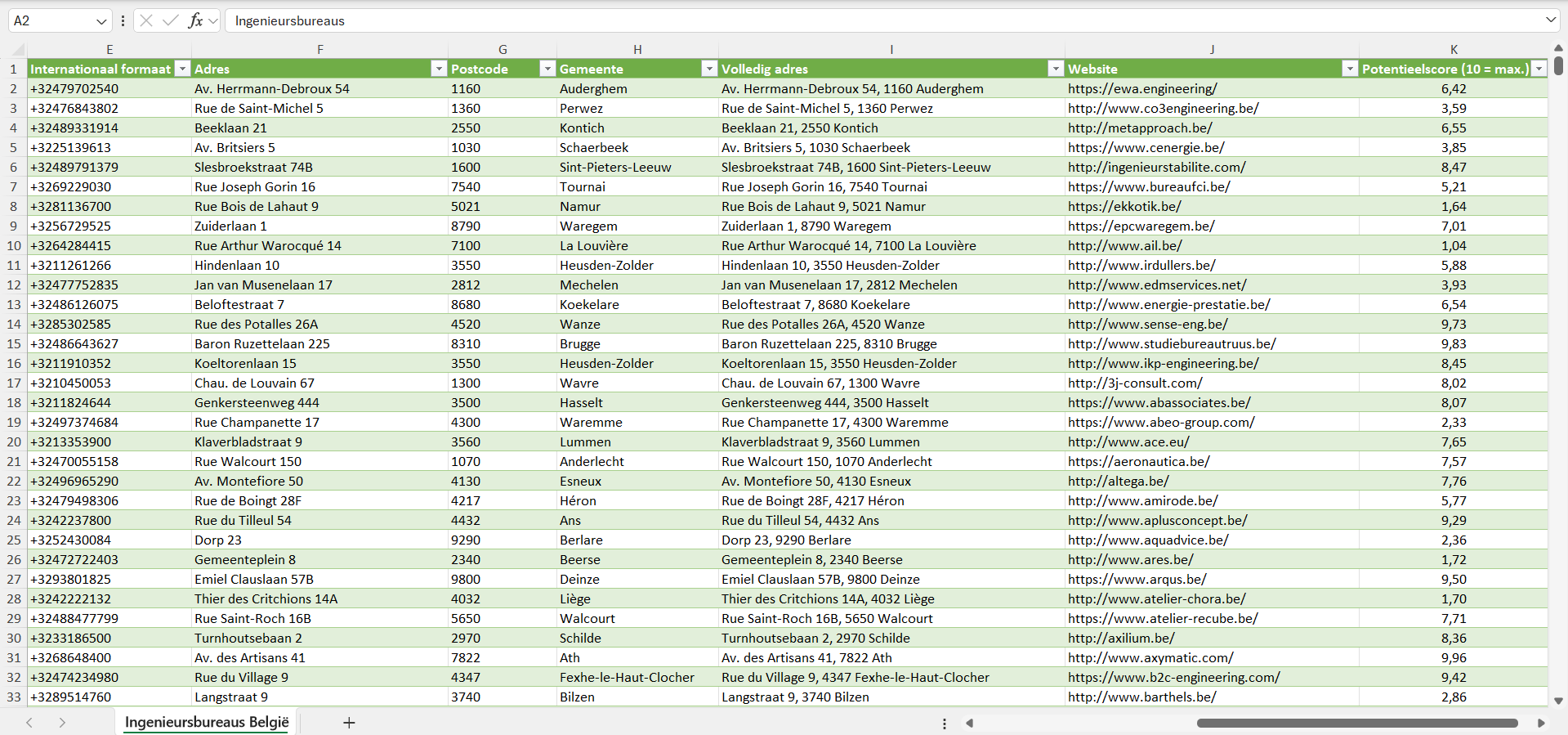 Voor elk ingenieursbureau hebben we bovendien een individuele potentieelscore van 1 tot 10 toegekend, gebaseerd op een reeks factoren zoals de geschatte bedrijfsgrootte, het geschatte aantal klanten en de koopkracht van de locatie.