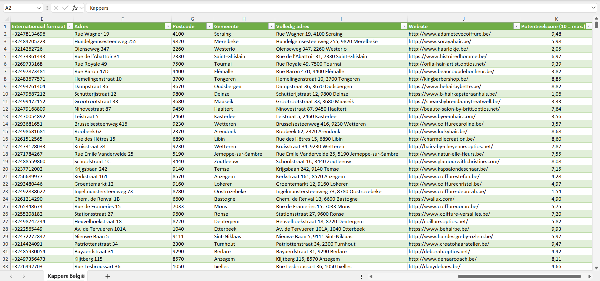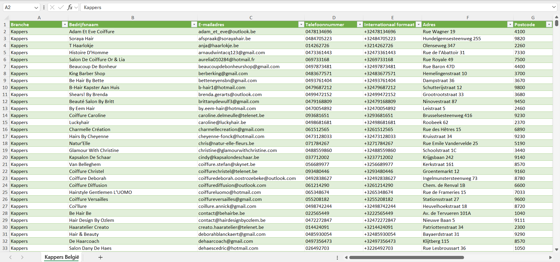 Na aankoop kun je de lijst met alle kappers in België direct downloaden als Excel-bestand. Deze is geschikt voor gebruik in veelgebruikte CRM- en verkoopsoftware, zoals Salesforce, Pipedrive, HubSpot, Mailchimp, Klaviyo, ActiveCampaign en andere. Op verzoek leveren we de gegevens van de kappers ook in andere formaten, zoals CSV.