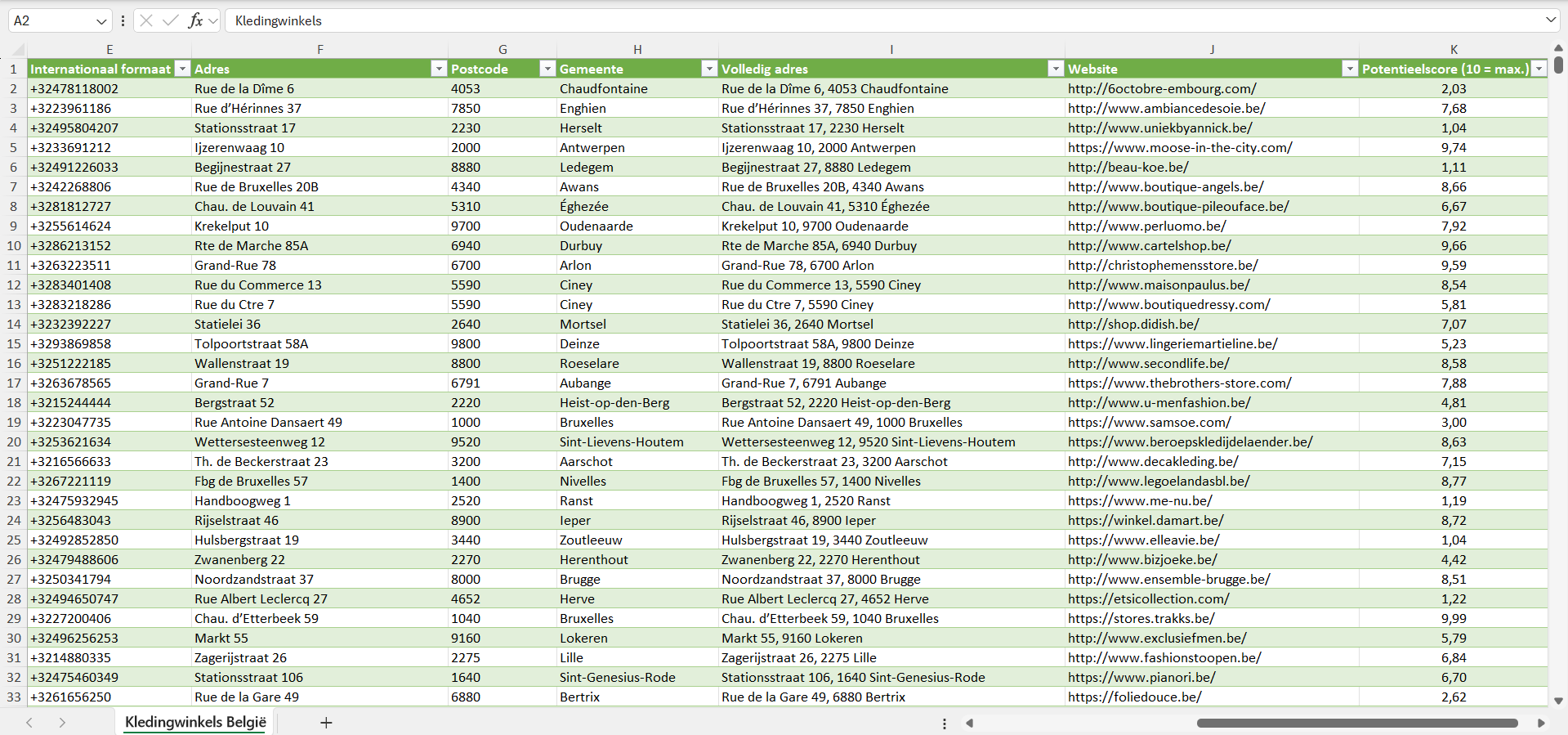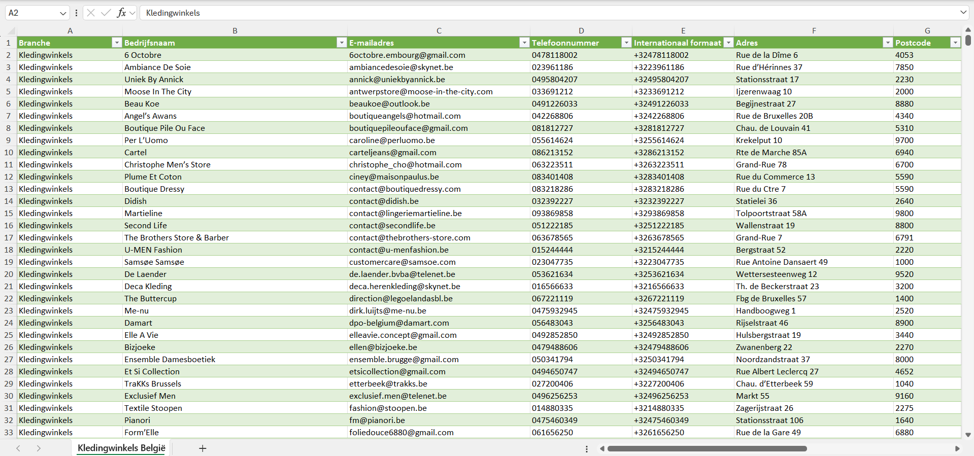 Na aankoop kun je de lijst met alle kledingwinkels in België direct downloaden als Excel-bestand. Deze is geschikt voor gebruik in veelgebruikte CRM- en verkoopsoftware, zoals Salesforce, Pipedrive, HubSpot, Mailchimp, Klaviyo, ActiveCampaign en andere. Op verzoek leveren we de gegevens van de kledingwinkels ook in andere formaten, zoals CSV.