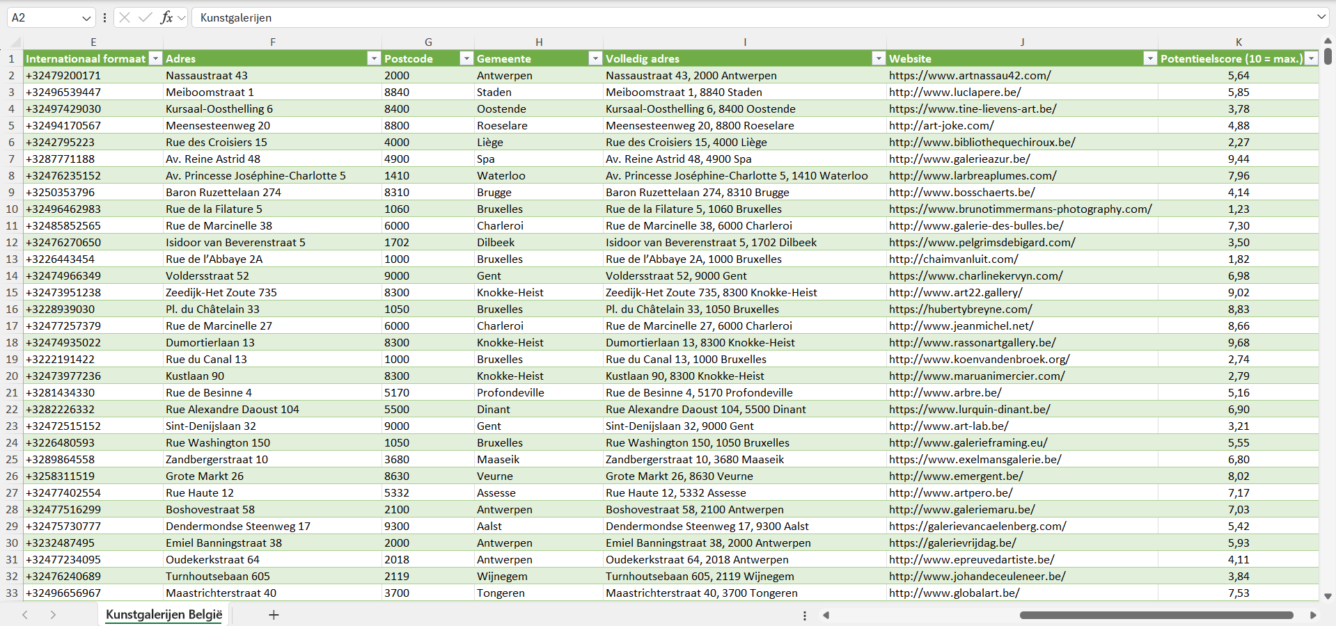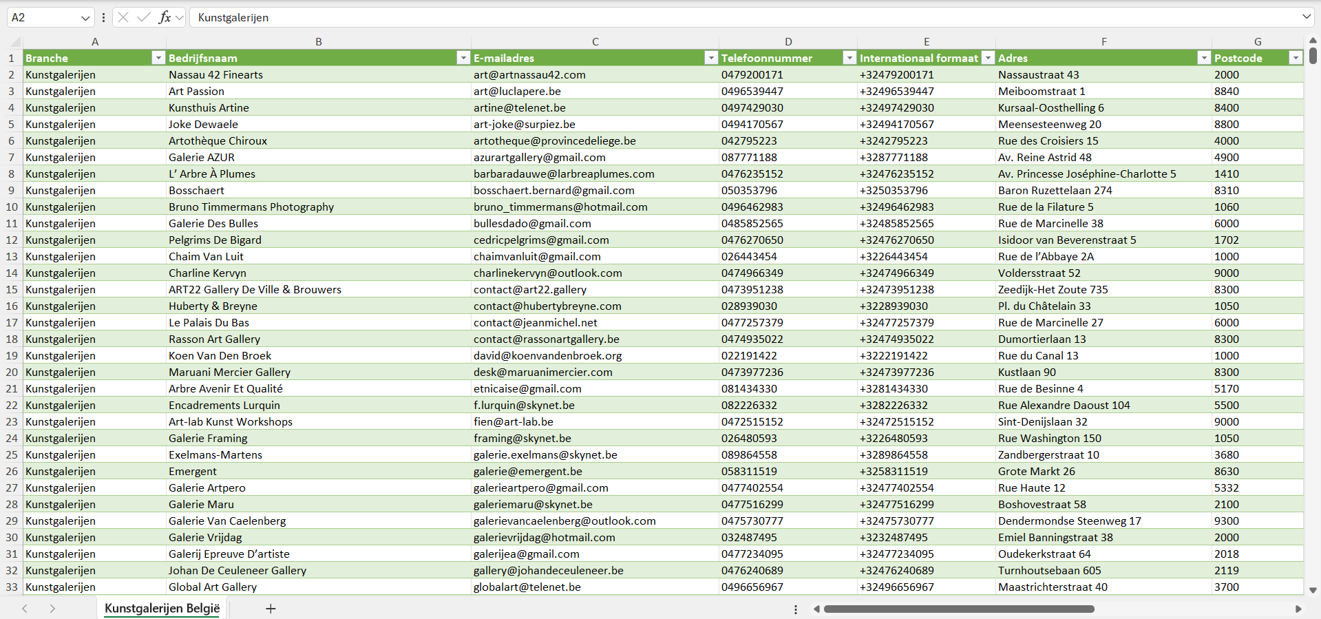 Na aankoop kun je de lijst met alle kunstgalerijen in België direct downloaden als Excel-bestand. Deze is geschikt voor gebruik in veelgebruikte CRM- en verkoopsoftware, zoals Salesforce, Pipedrive, HubSpot, Mailchimp, Klaviyo, ActiveCampaign en andere. Op verzoek leveren we de gegevens van de kunstgalerijen ook in andere formaten, zoals CSV.