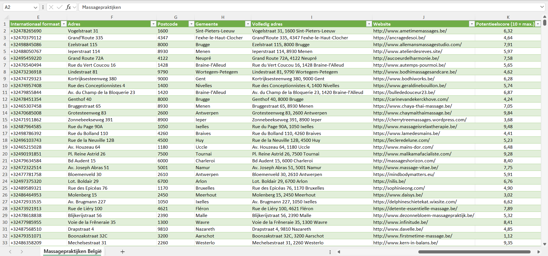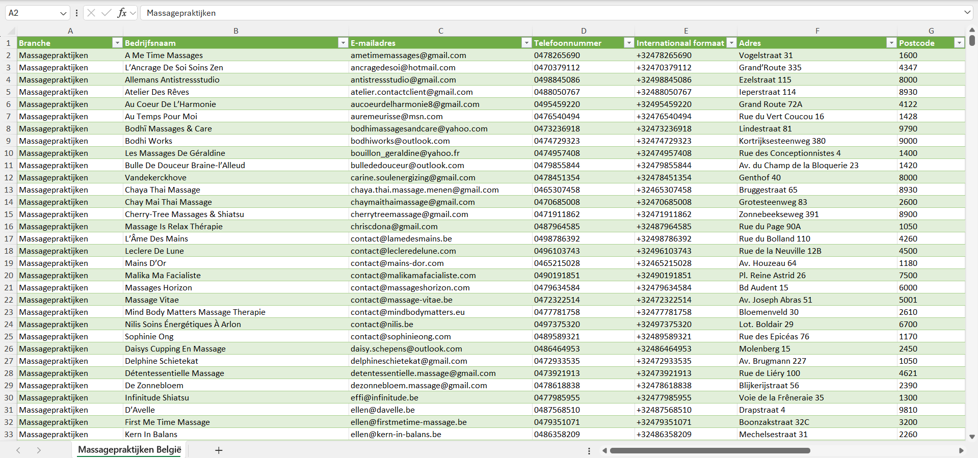 Dataset van alle massagepraktijken in België