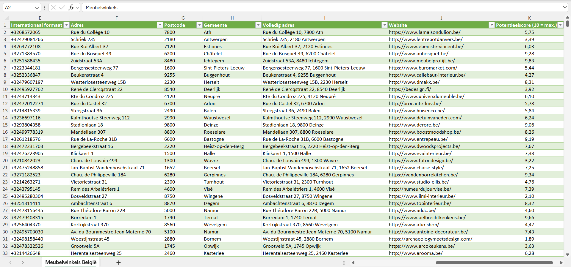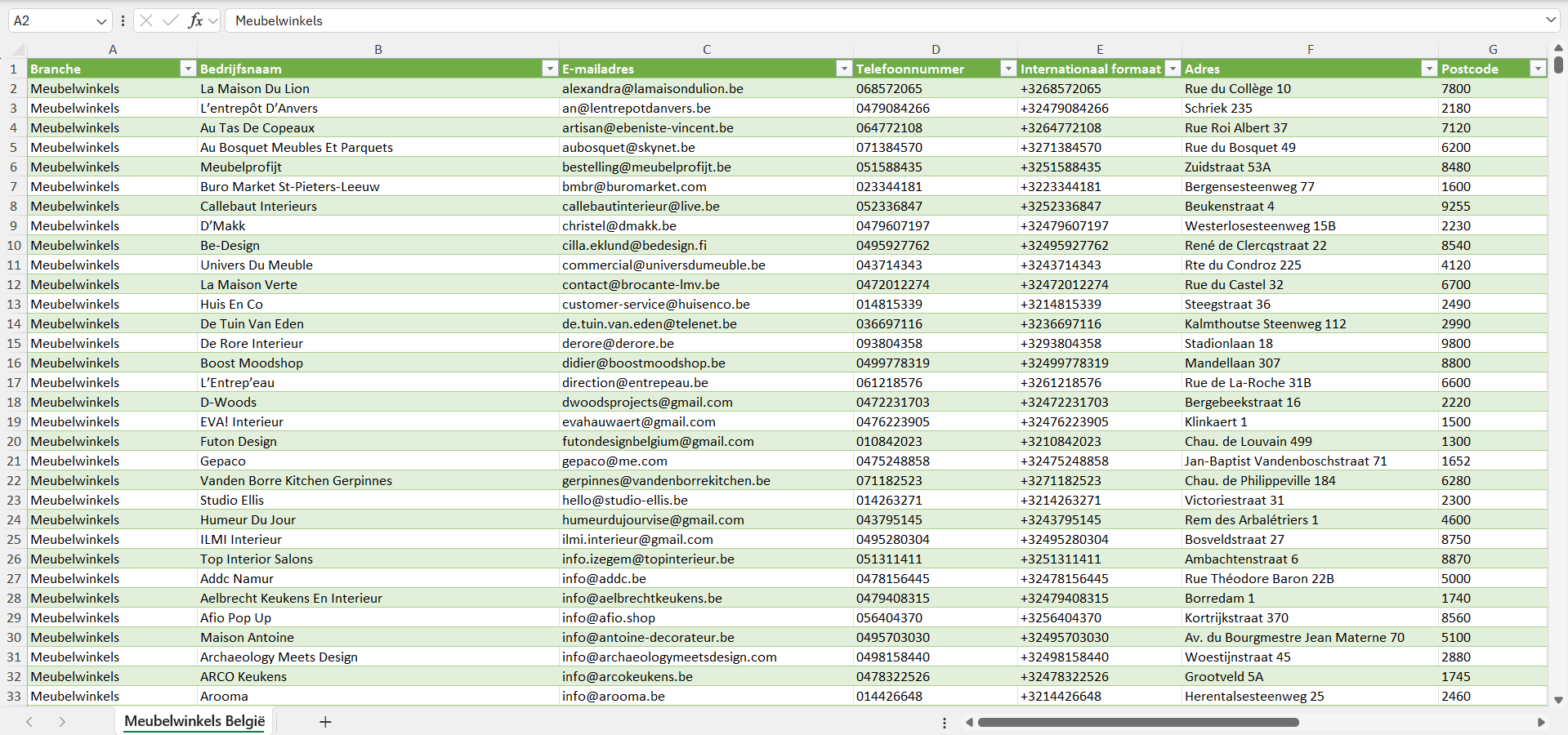 Na aankoop kun je de lijst met alle meubelwinkels in België direct downloaden als Excel-bestand. Deze is geschikt voor gebruik in veelgebruikte CRM- en verkoopsoftware, zoals Salesforce, Pipedrive, HubSpot, Mailchimp, Klaviyo, ActiveCampaign en andere. Op verzoek leveren we de gegevens van de meubelwinkels ook in andere formaten, zoals CSV.