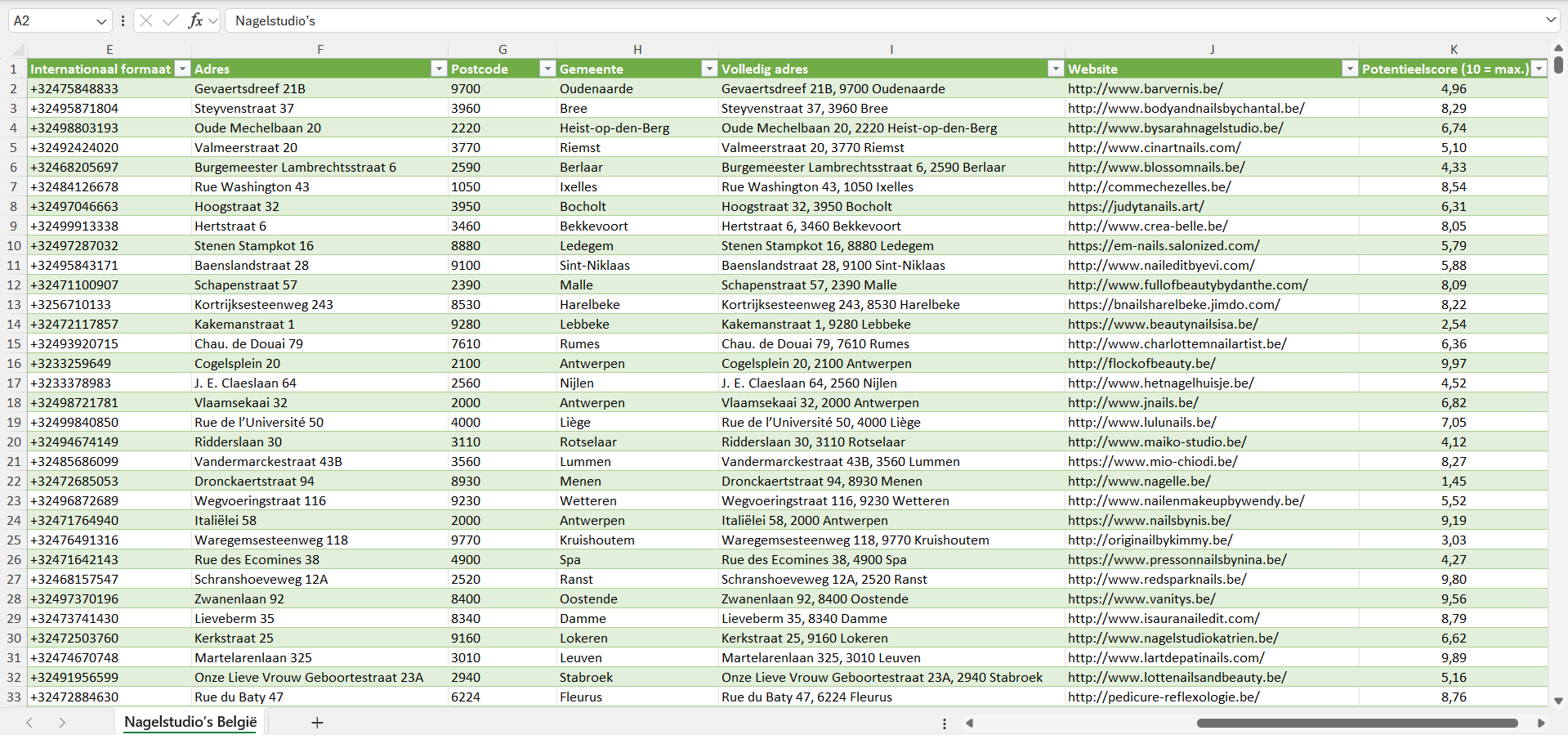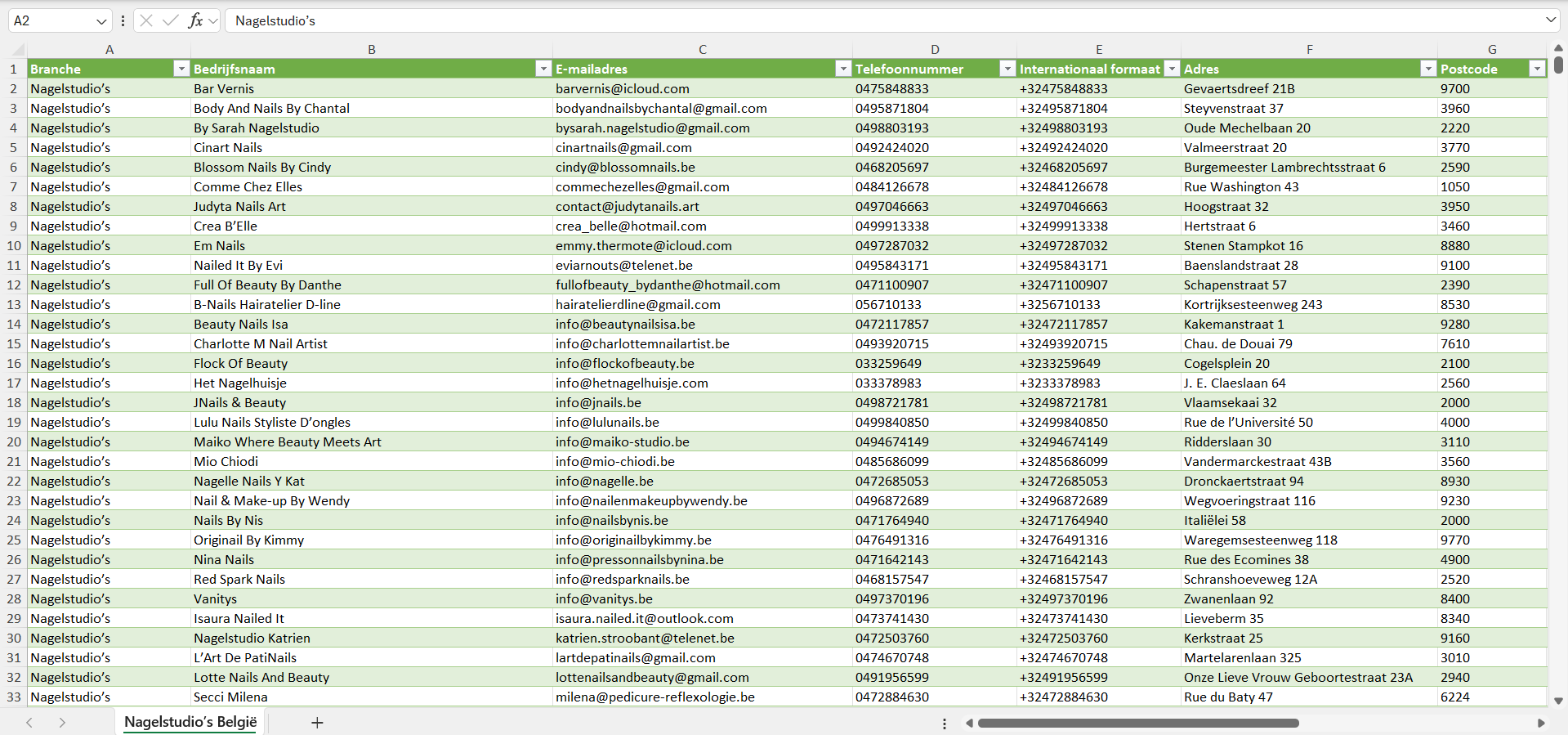 Na aankoop kun je de lijst met alle nagelstudio’s in België direct downloaden als Excel-bestand. Deze is geschikt voor gebruik in veelgebruikte CRM- en verkoopsoftware, zoals Salesforce, Pipedrive, HubSpot, Mailchimp, Klaviyo, ActiveCampaign en andere. Op verzoek leveren we de gegevens van de nagelstudio’s ook in andere formaten, zoals CSV.