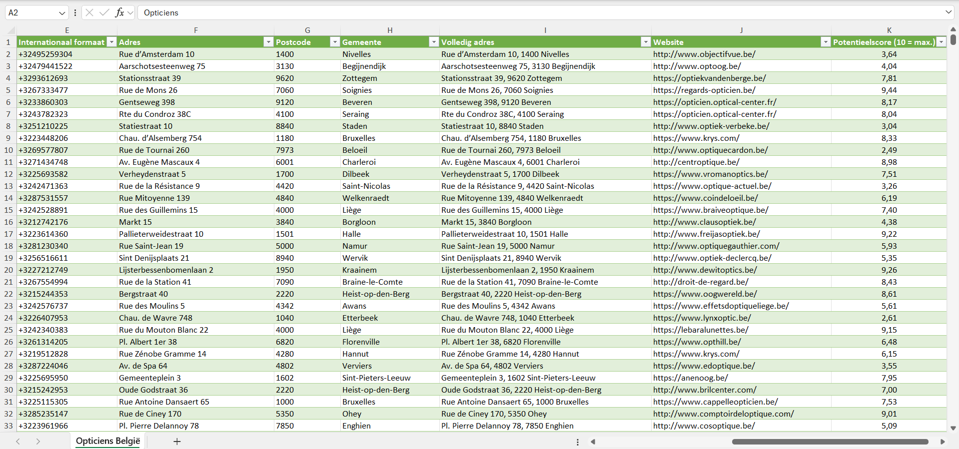 Voor elke opticien hebben we bovendien een individuele potentieelscore van 1 tot 10 toegekend, gebaseerd op een reeks factoren zoals de geschatte bedrijfsgrootte, het geschatte aantal klanten en de koopkracht van de locatie.