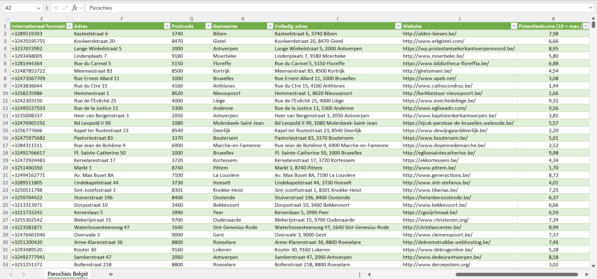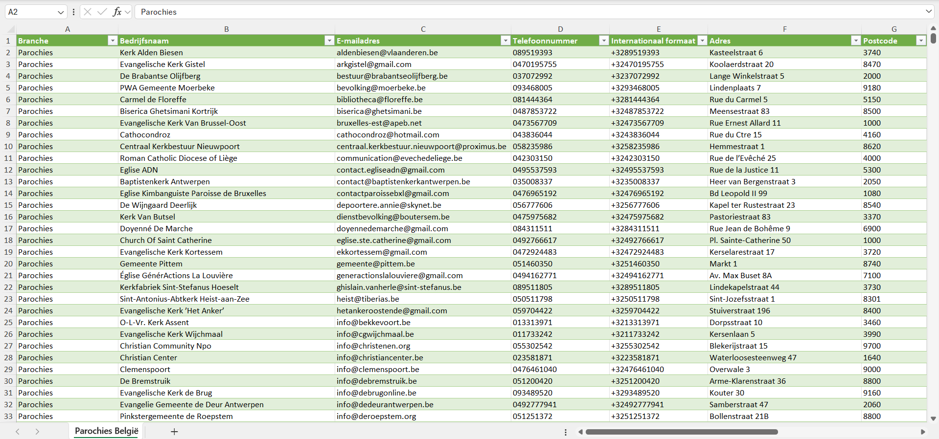 Na aankoop kun je de lijst met alle parochies in België direct downloaden als Excel-bestand. Deze is geschikt voor gebruik in veelgebruikte CRM- en verkoopsoftware, zoals Salesforce, Pipedrive, HubSpot, Mailchimp, Klaviyo, ActiveCampaign en andere. Op verzoek leveren we de gegevens van de parochies ook in andere formaten, zoals CSV.