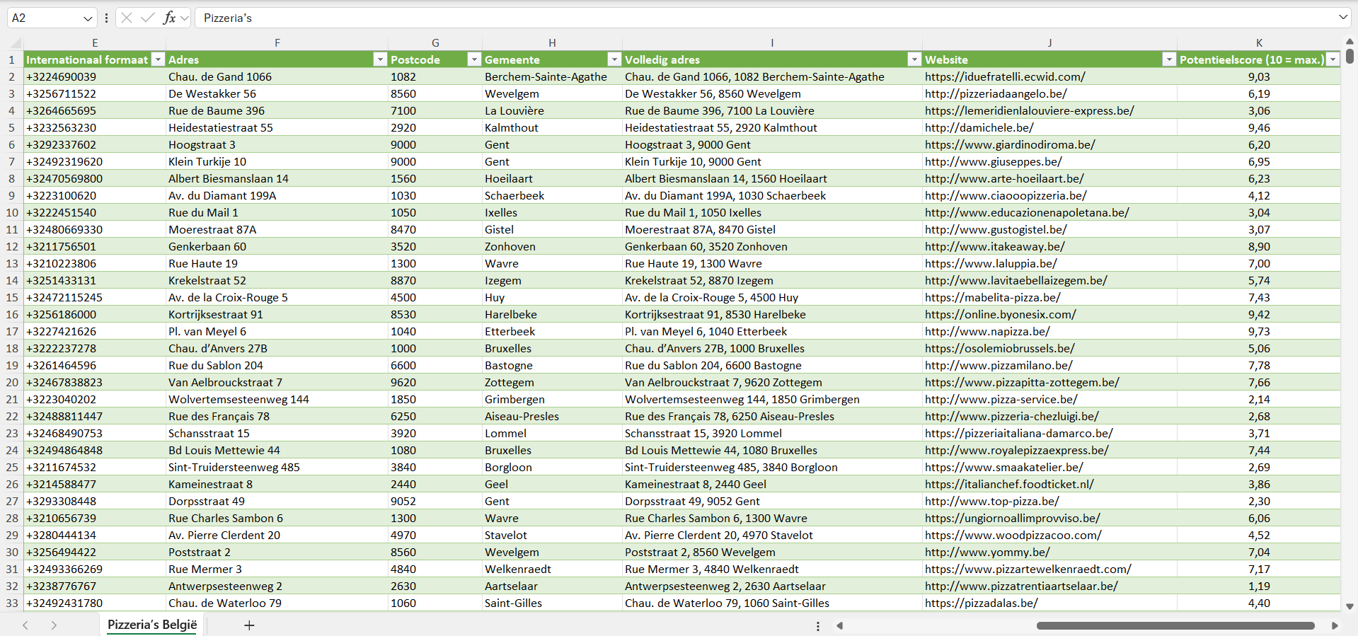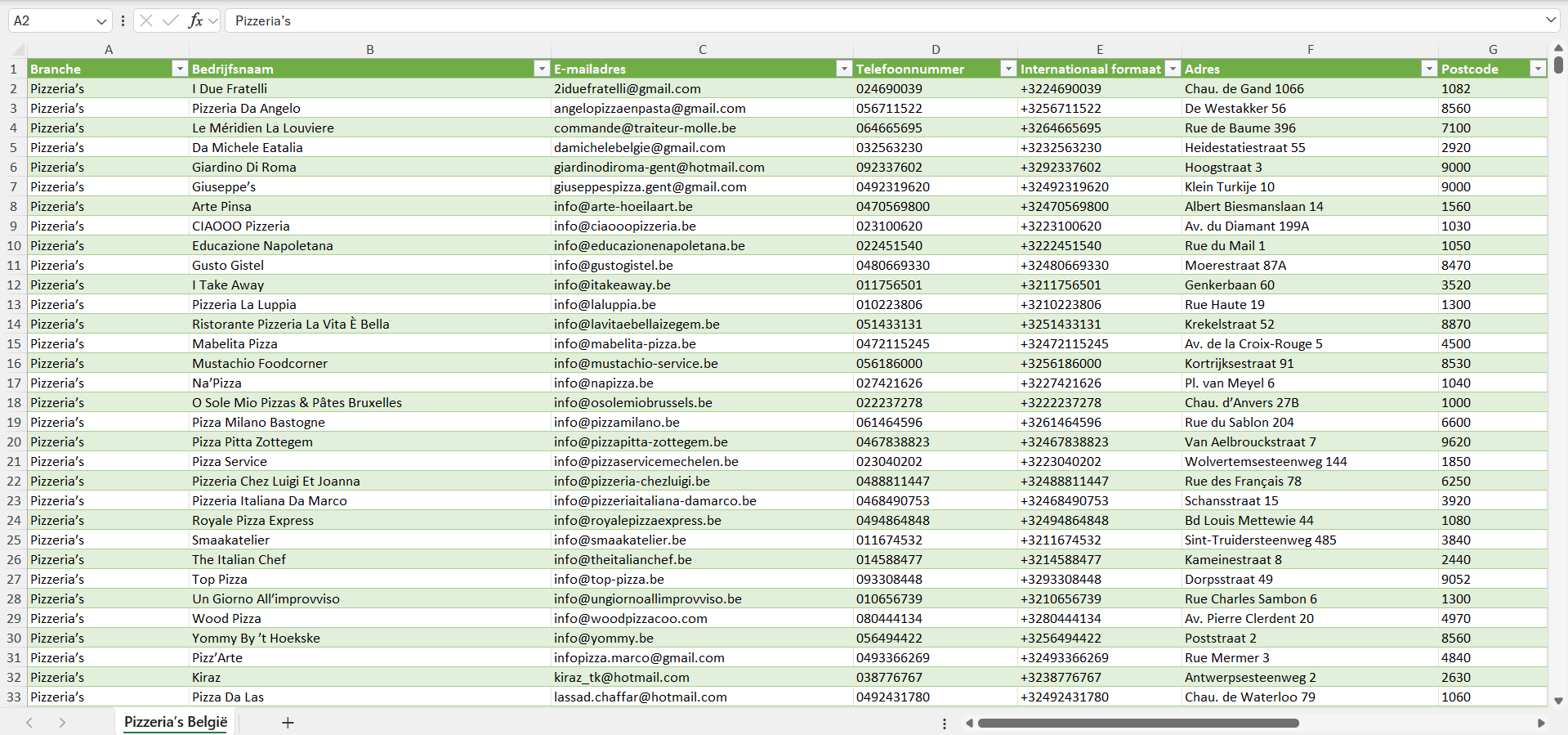 Na aankoop kun je de lijst met alle pizzeria’s in België direct downloaden als Excel-bestand. Deze is geschikt voor gebruik in veelgebruikte CRM- en verkoopsoftware, zoals Salesforce, Pipedrive, HubSpot, Mailchimp, Klaviyo, ActiveCampaign en andere. Op verzoek leveren we de gegevens van de pizzeria’s ook in andere formaten, zoals CSV.