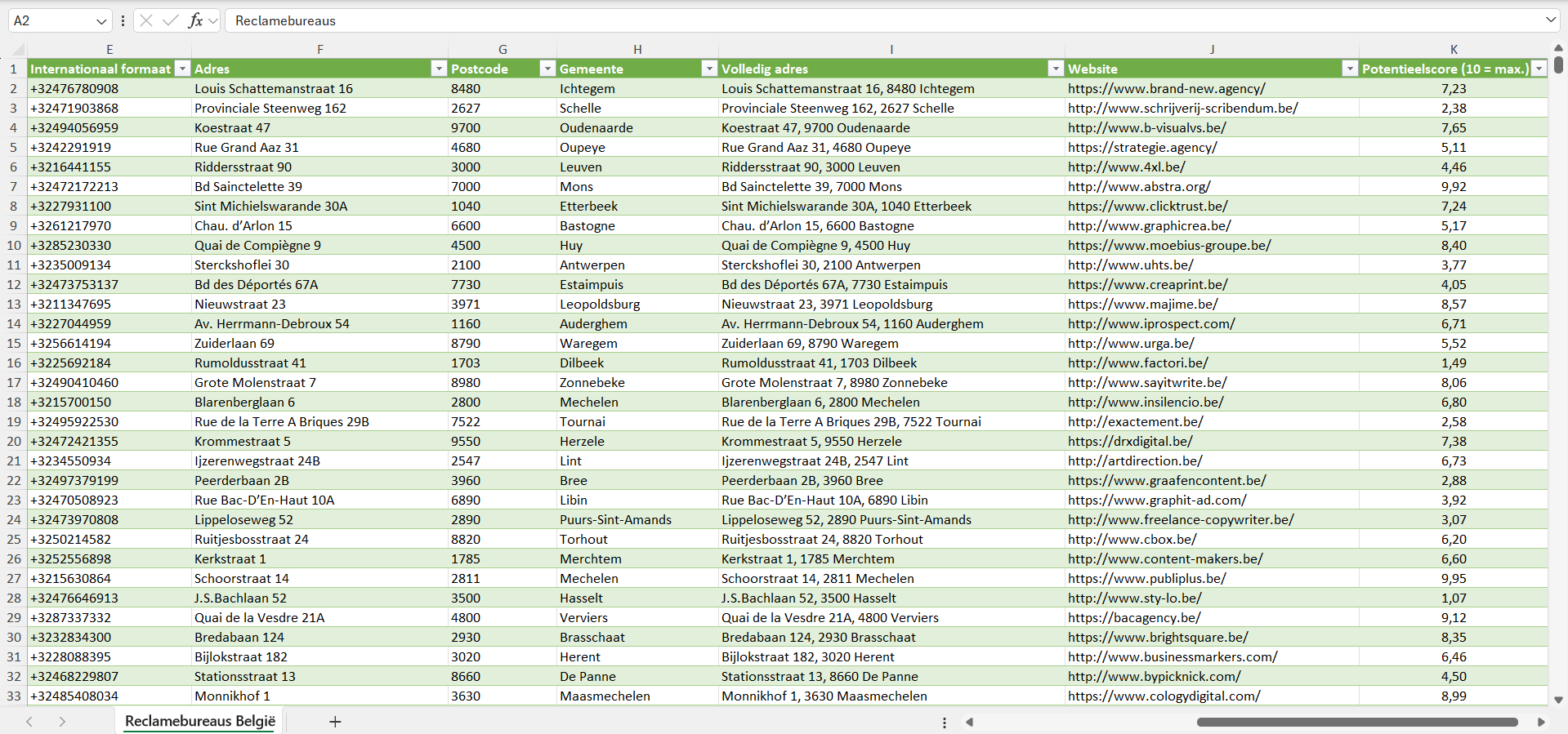 Voor elk reclamebureau hebben we bovendien een individuele potentieelscore van 1 tot 10 toegekend, gebaseerd op een reeks factoren zoals de geschatte bedrijfsgrootte, het geschatte aantal klanten en de koopkracht van de locatie.