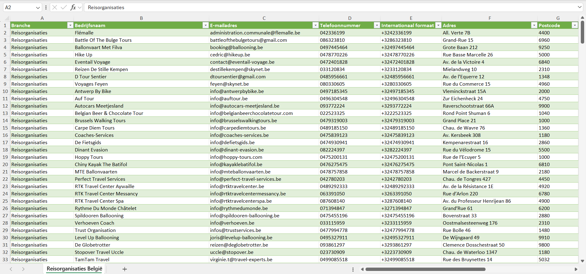 Na aankoop kun je de lijst met alle reisorganisaties in België direct downloaden als Excel-bestand. Deze is geschikt voor gebruik in veelgebruikte CRM- en verkoopsoftware, zoals Salesforce, Pipedrive, HubSpot, Mailchimp, Klaviyo, ActiveCampaign en andere. Op verzoek leveren we de gegevens van de reisorganisaties ook in andere formaten, zoals CSV.