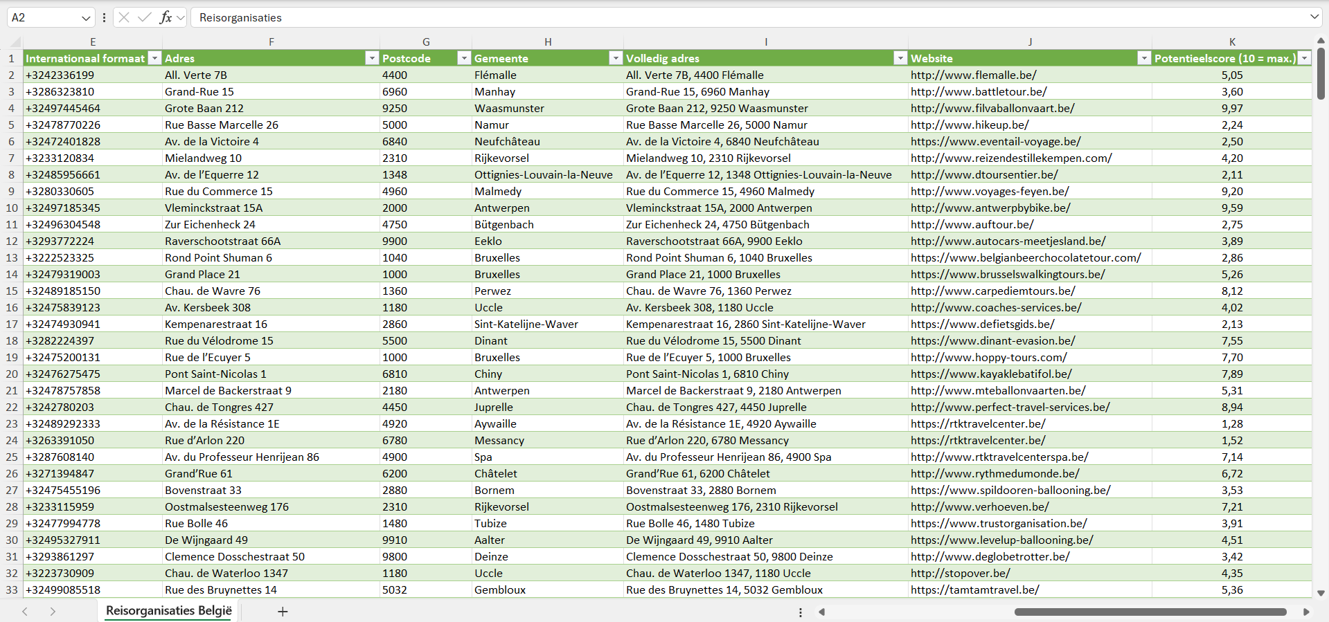 Voor elke reisorganisatie hebben we bovendien een individuele potentieelscore van 1 tot 10 toegekend, gebaseerd op een reeks factoren zoals de geschatte bedrijfsgrootte, het geschatte aantal klanten en de koopkracht van de locatie.