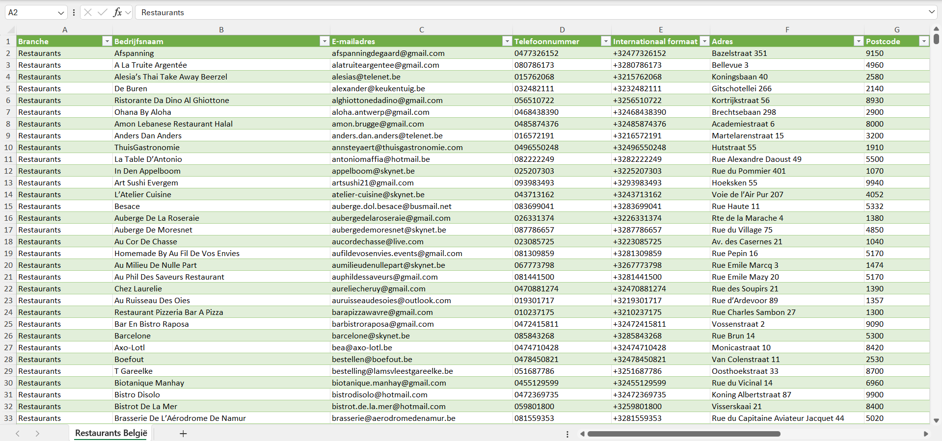 Na aankoop kun je de lijst met alle restaurants in België direct downloaden als Excel-bestand. Deze is geschikt voor gebruik in veelgebruikte CRM- en verkoopsoftware, zoals Salesforce, Pipedrive, HubSpot, Mailchimp, Klaviyo, ActiveCampaign en andere. Op verzoek leveren we de gegevens van de restaurants ook in andere formaten, zoals CSV.