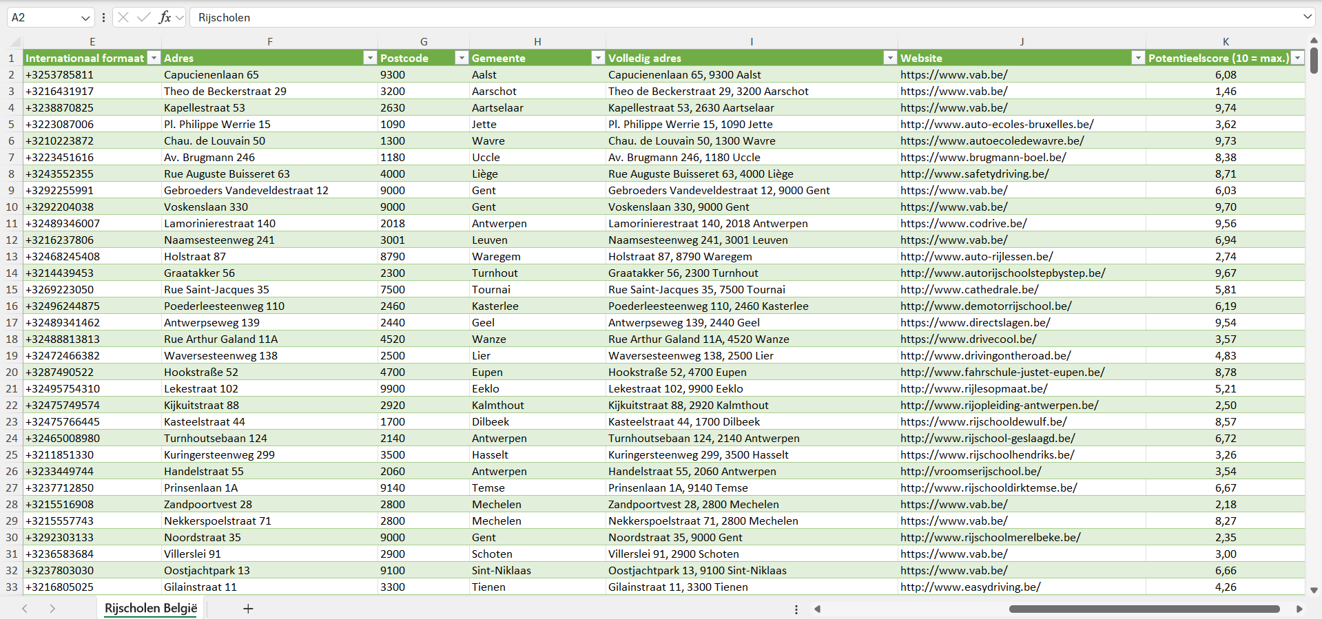 Voor elke rijschool hebben we bovendien een individuele potentieelscore van 1 tot 10 toegekend, gebaseerd op een reeks factoren zoals de geschatte bedrijfsgrootte, het geschatte aantal klanten en de koopkracht van de locatie.