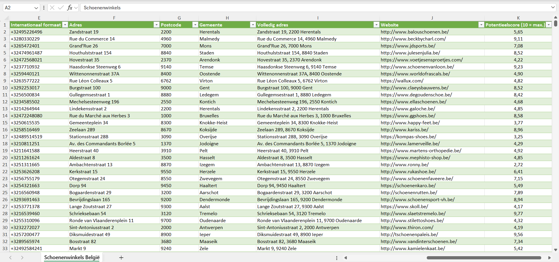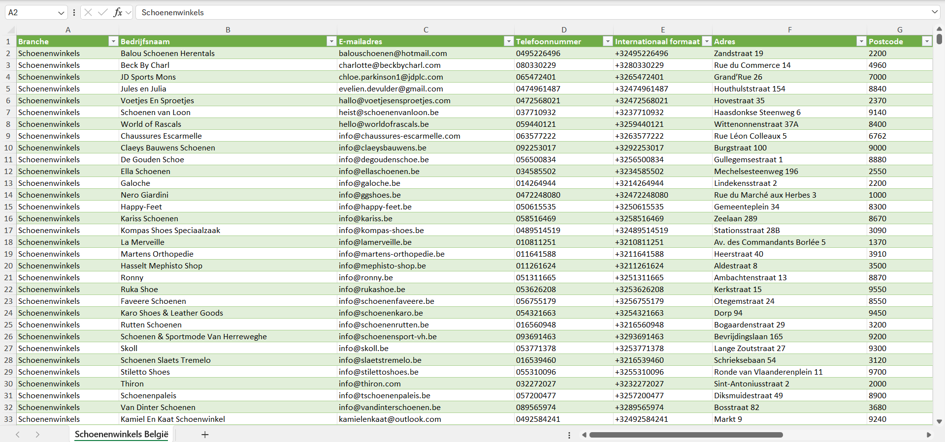 Na aankoop kun je de lijst met alle schoenenwinkels in België direct downloaden als Excel-bestand. Deze is geschikt voor gebruik in veelgebruikte CRM- en verkoopsoftware, zoals Salesforce, Pipedrive, HubSpot, Mailchimp, Klaviyo, ActiveCampaign en andere. Op verzoek leveren we de gegevens van de schoenenwinkels ook in andere formaten, zoals CSV.