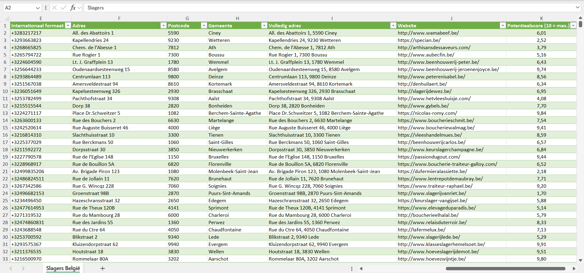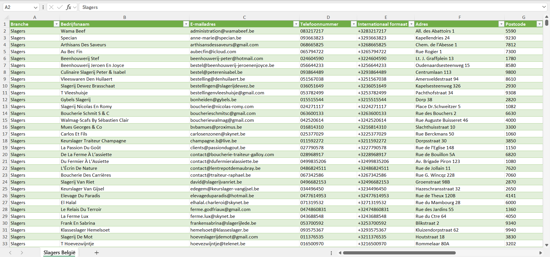 Na aankoop kun je de lijst met alle slagers in België direct downloaden als Excel-bestand. Deze is geschikt voor gebruik in veelgebruikte CRM- en verkoopsoftware, zoals Salesforce, Pipedrive, HubSpot, Mailchimp, Klaviyo, ActiveCampaign en andere. Op verzoek leveren we de gegevens van de slagers ook in andere formaten, zoals CSV.