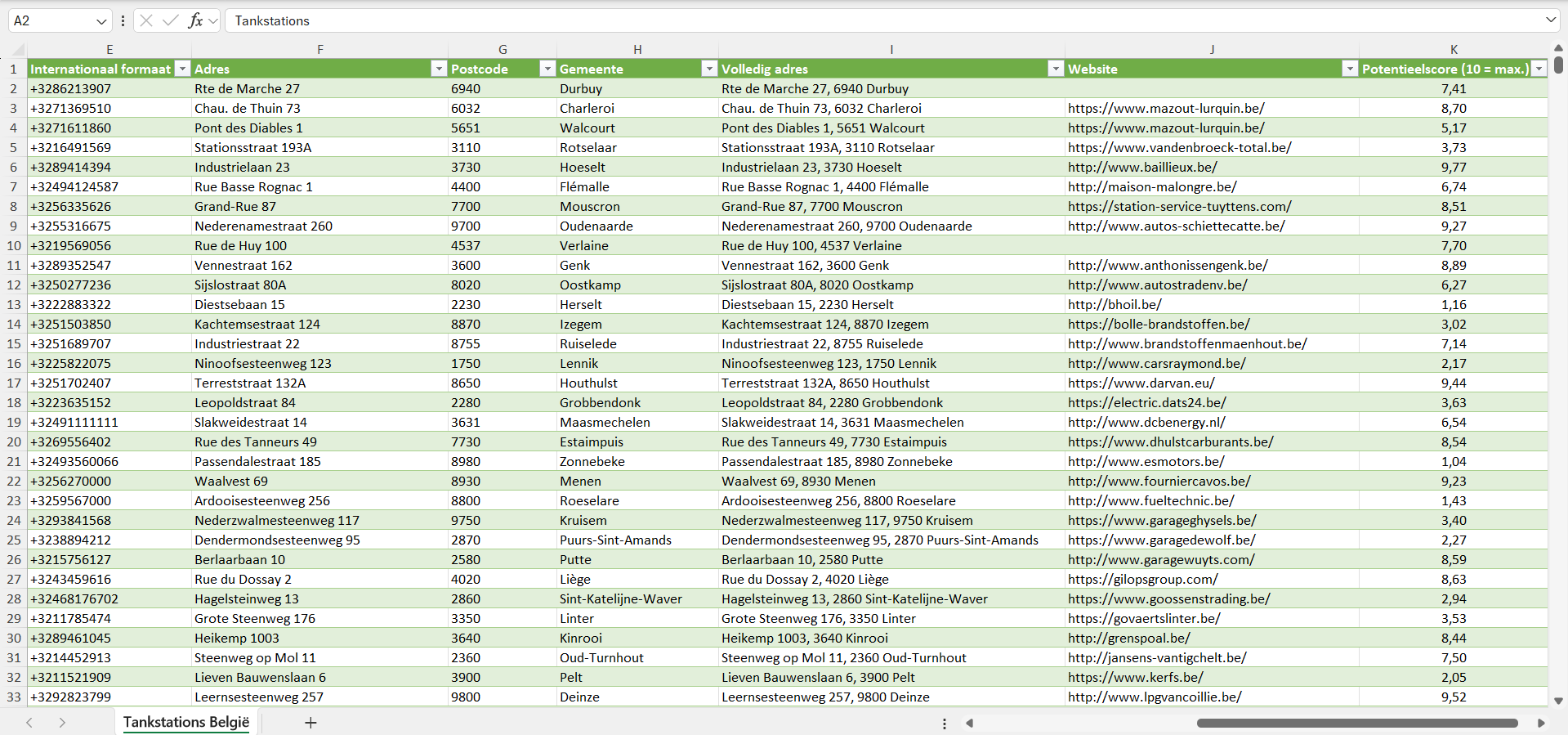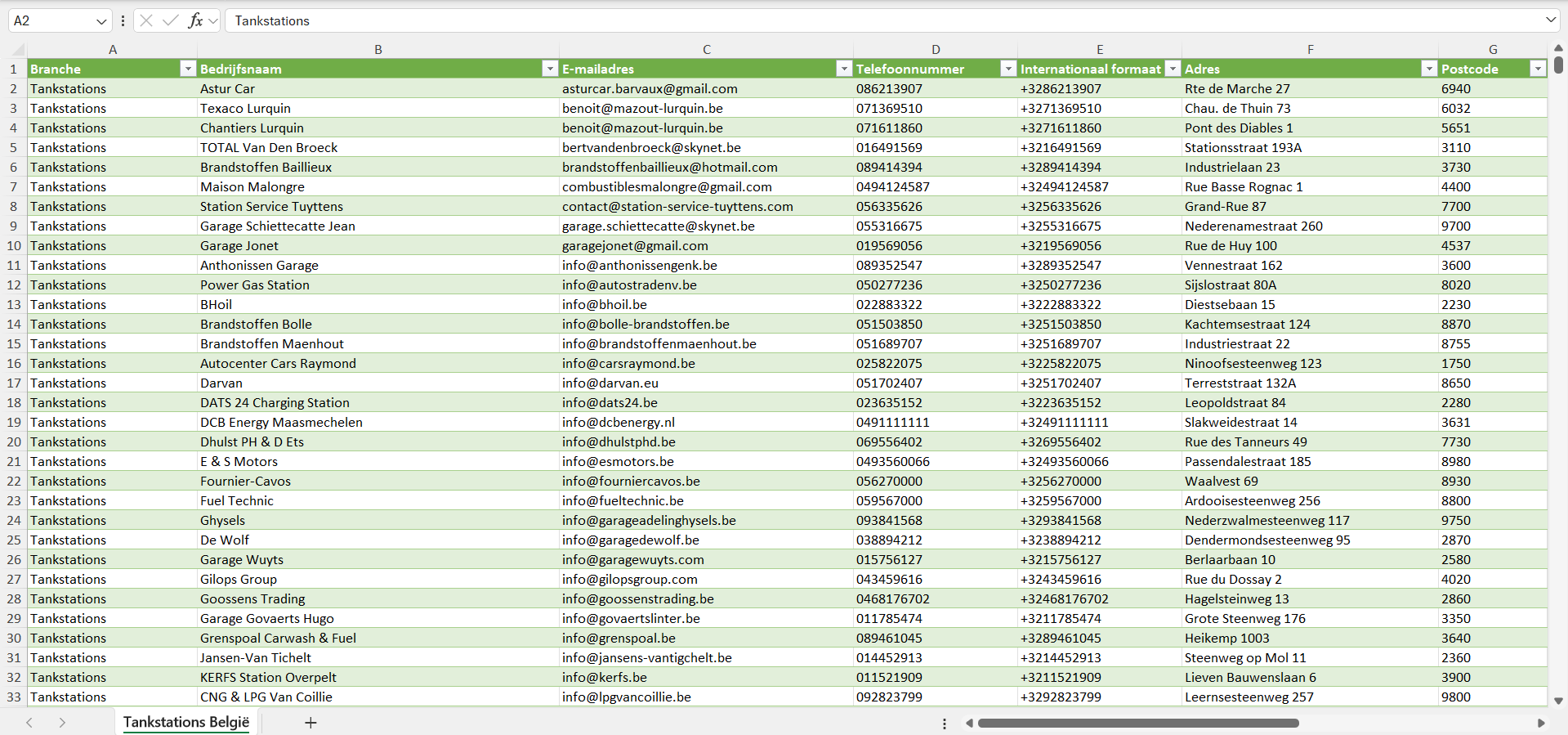 Na aankoop kun je de lijst met alle tankstations in België direct downloaden als Excel-bestand. Deze is geschikt voor gebruik in veelgebruikte CRM- en verkoopsoftware, zoals Salesforce, Pipedrive, HubSpot, Mailchimp, Klaviyo, ActiveCampaign en andere. Op verzoek leveren we de gegevens van de tankstations ook in andere formaten, zoals CSV.