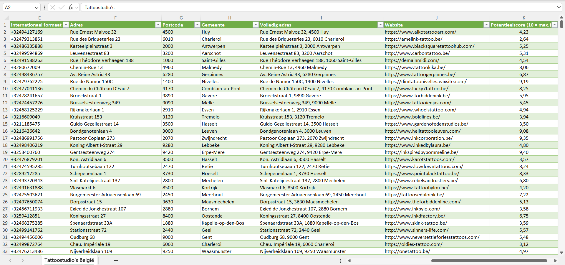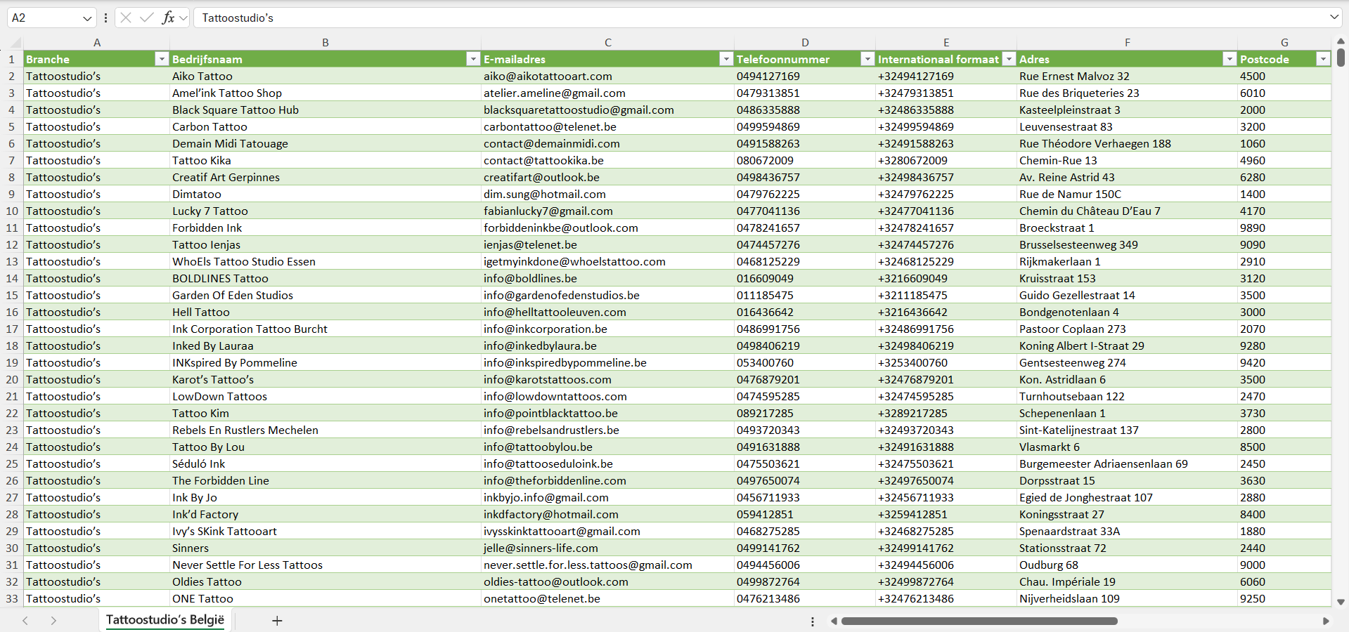 Na aankoop kun je de lijst met alle tattoostudio’s in België direct downloaden als Excel-bestand. Deze is geschikt voor gebruik in veelgebruikte CRM- en verkoopsoftware, zoals Salesforce, Pipedrive, HubSpot, Mailchimp, Klaviyo, ActiveCampaign en andere. Op verzoek leveren we de gegevens van de tattoostudio’s ook in andere formaten, zoals CSV.