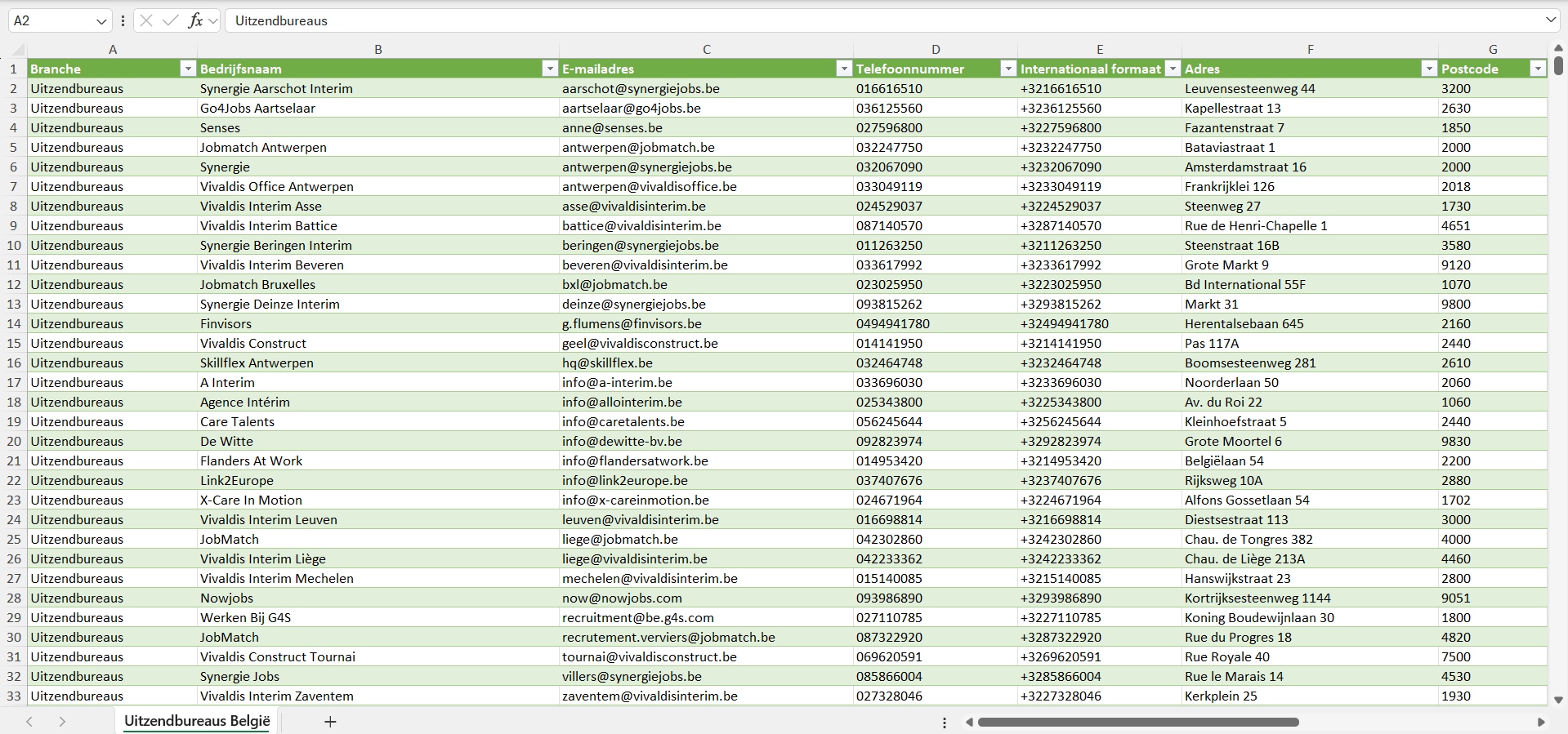 Na aankoop kun je de lijst met alle uitzendbureaus in België direct downloaden als Excel-bestand. Deze is geschikt voor gebruik in veelgebruikte CRM- en verkoopsoftware, zoals Salesforce, Pipedrive, HubSpot, Mailchimp, Klaviyo, ActiveCampaign en andere. Op verzoek leveren we de gegevens van de uitzendbureaus ook in andere formaten, zoals CSV.