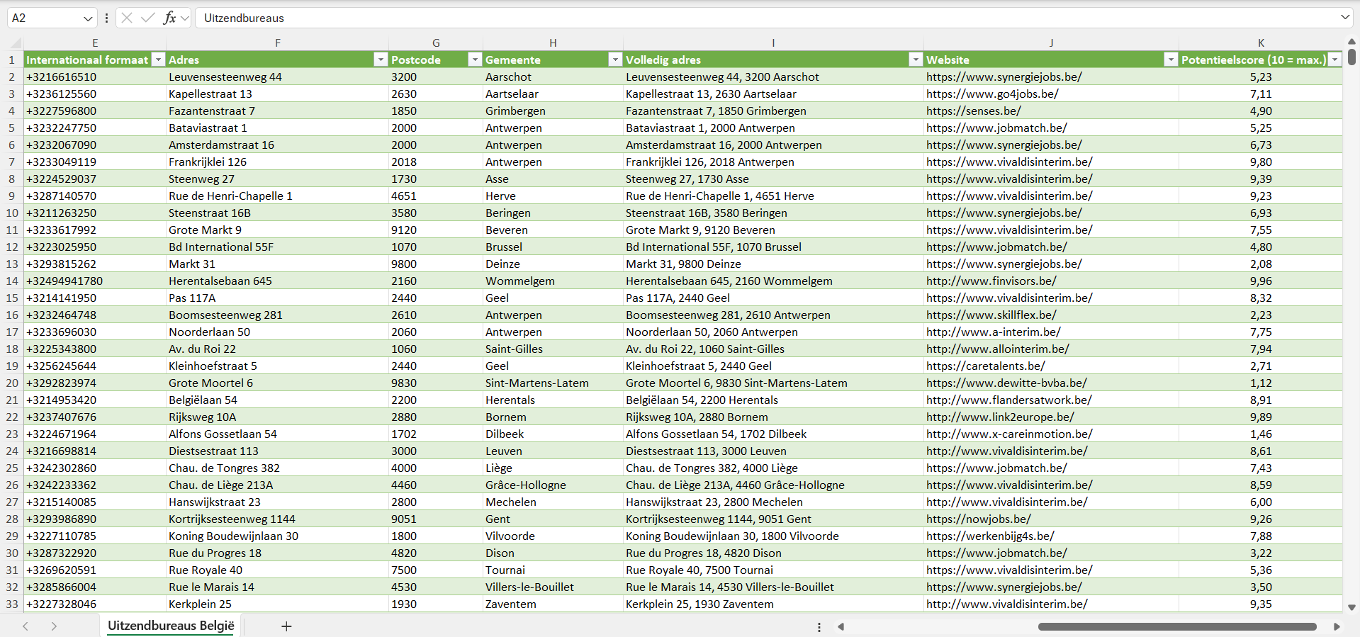 Voor elk uitzendbureau hebben we bovendien een individuele potentieelscore van 1 tot 10 toegekend, gebaseerd op een reeks factoren zoals de geschatte bedrijfsgrootte, het geschatte aantal klanten en de koopkracht van de locatie.