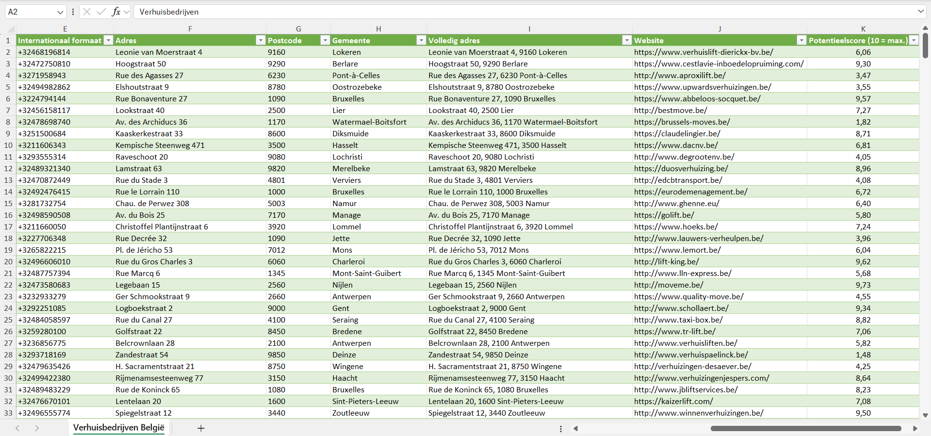 Na aankoop kun je de lijst met alle verhuisbedrijven in België direct downloaden als Excel-bestand. Deze is geschikt voor gebruik in veelgebruikte CRM- en verkoopsoftware, zoals Salesforce, Pipedrive, HubSpot, Mailchimp, Klaviyo, ActiveCampaign en andere. Op verzoek leveren we de gegevens van de verhuisbedrijven ook in andere formaten, zoals CSV.