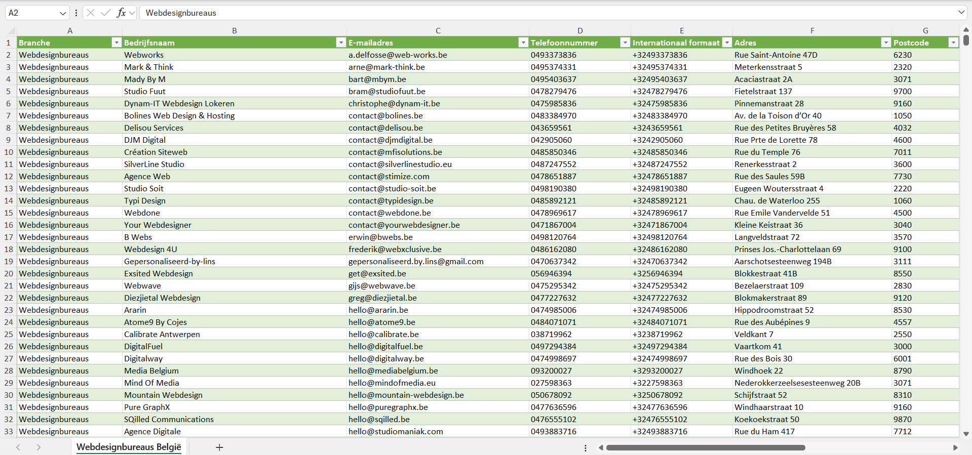 Na aankoop kun je de lijst met alle webdesignbureaus in België direct downloaden als Excel-bestand. Deze is geschikt voor gebruik in veelgebruikte CRM- en verkoopsoftware, zoals Salesforce, Pipedrive, HubSpot, Mailchimp, Klaviyo, ActiveCampaign en andere. Op verzoek leveren we de gegevens van de webdesignbureaus ook in andere formaten, zoals CSV.