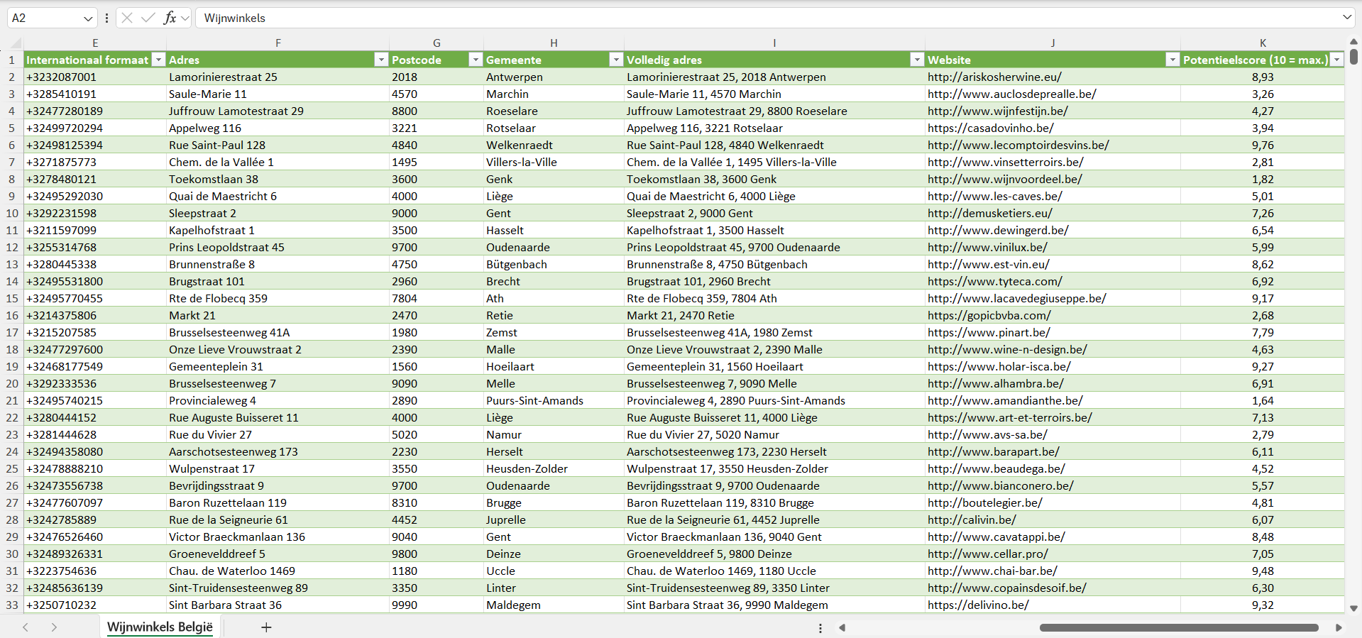 Na aankoop kun je de lijst met alle wijnwinkels in België direct downloaden als Excel-bestand. Deze is geschikt voor gebruik in veelgebruikte CRM- en verkoopsoftware, zoals Salesforce, Pipedrive, HubSpot, Mailchimp, Klaviyo, ActiveCampaign en andere. Op verzoek leveren we de gegevens van de wijnwinkels ook in andere formaten, zoals CSV.