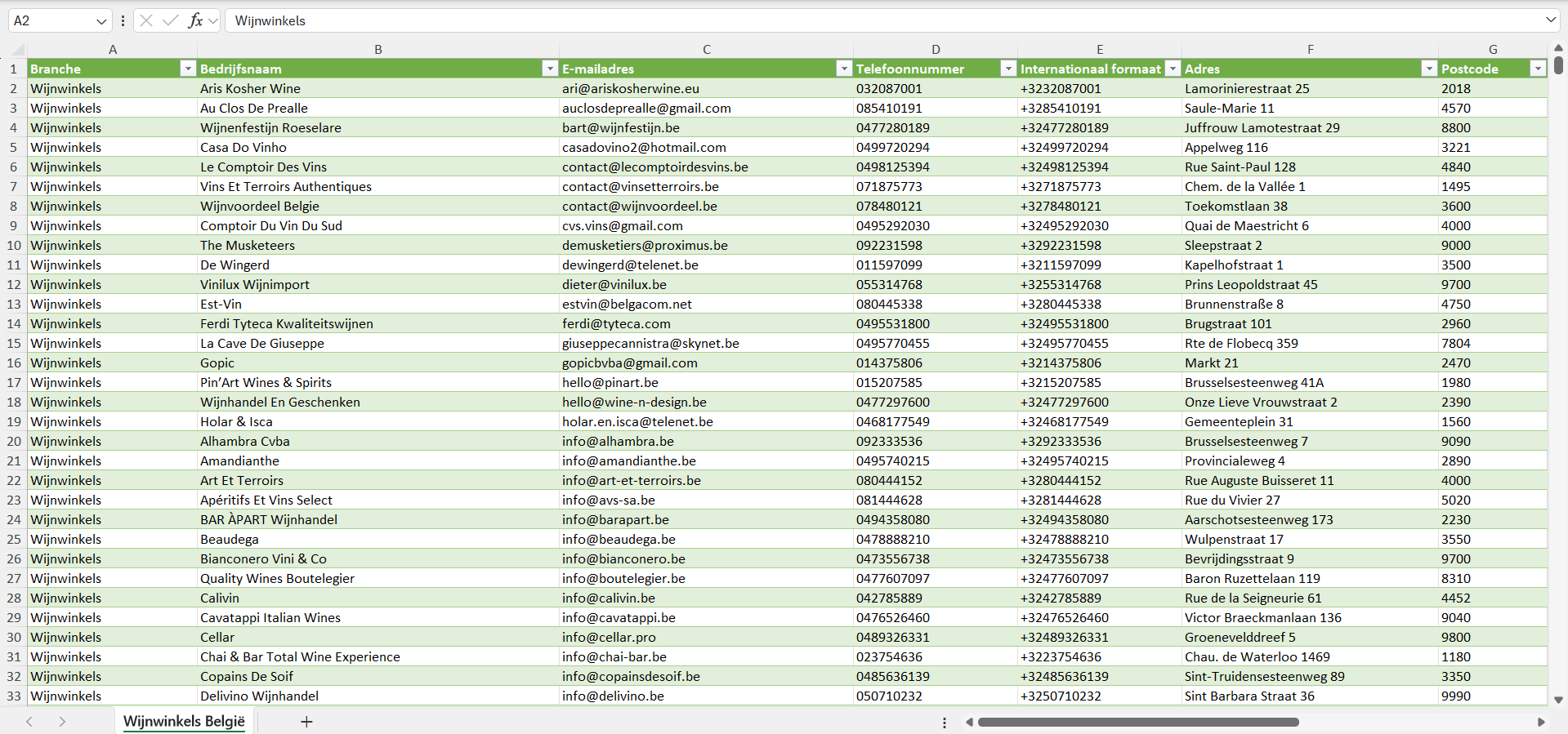 Bedrijvenlijsten.be is opgericht door mensen uit de verkoop die zelf hebben ervaren hoe lastig het is om betrouwbare en uitgebreide zakelijke contactgegevens te vinden voor een eerlijke prijs. Omdat we onze eigen lijsten lange tijd intensief hebben gebruikt, weten we waar het in de praktijk op aankomt. Daarom leveren we een lijst van alle wijnwinkels in België die klaar is voor direct gebruik, zodat je je ideale klanten efficiënt kunt bereiken.