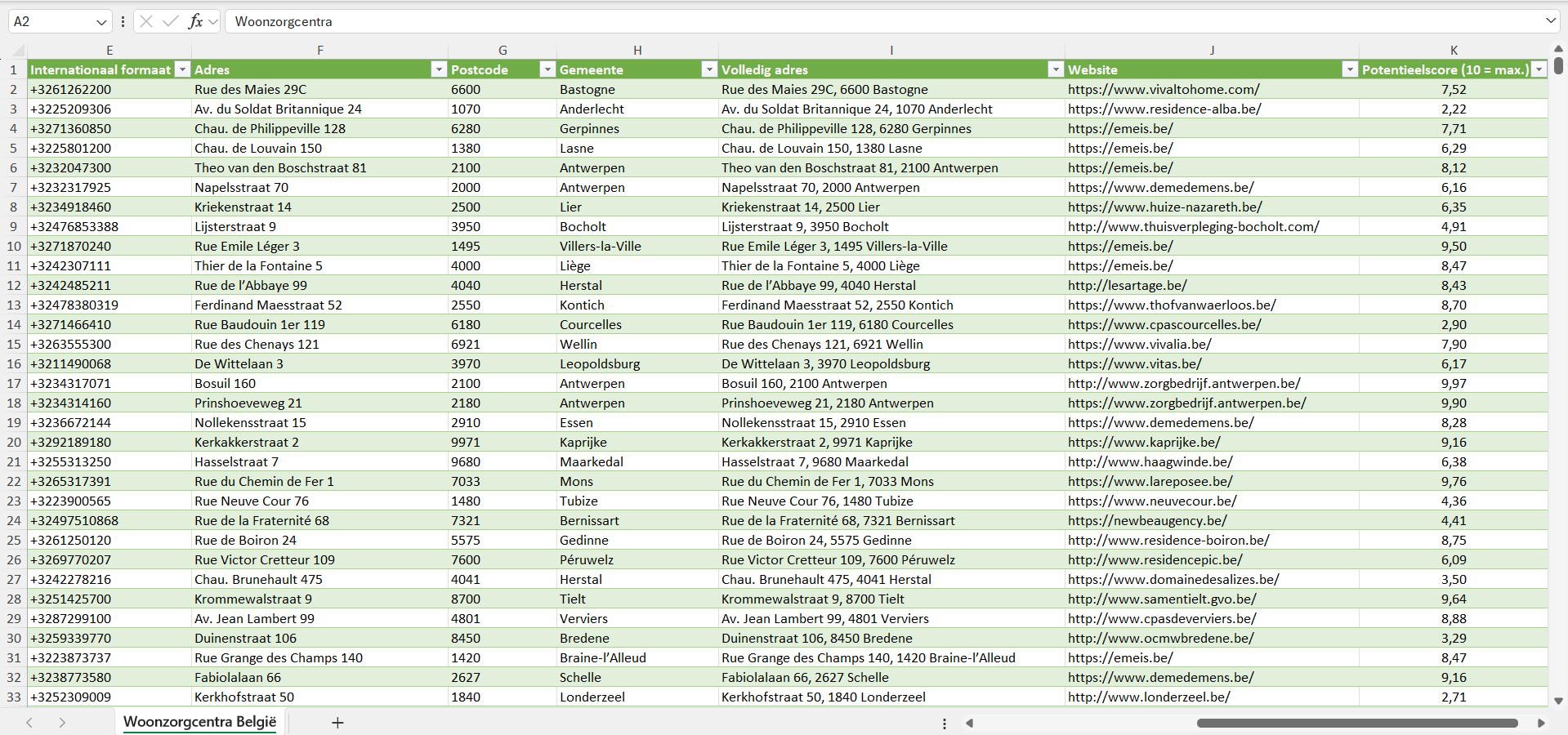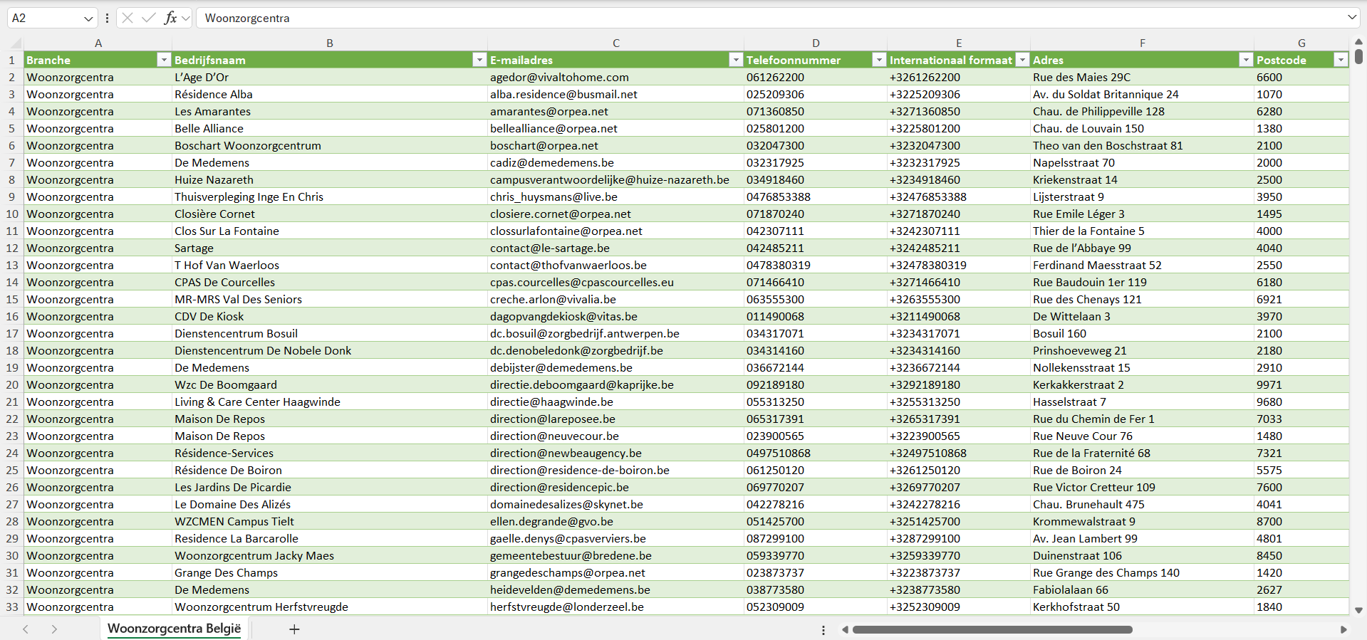Na aankoop kun je de lijst met alle woonzorgcentra in België direct downloaden als Excel-bestand. Deze is geschikt voor gebruik in veelgebruikte CRM- en verkoopsoftware, zoals Salesforce, Pipedrive, HubSpot, Mailchimp, Klaviyo, ActiveCampaign en andere. Op verzoek leveren we de gegevens van de woonzorgcentra ook in andere formaten, zoals CSV.